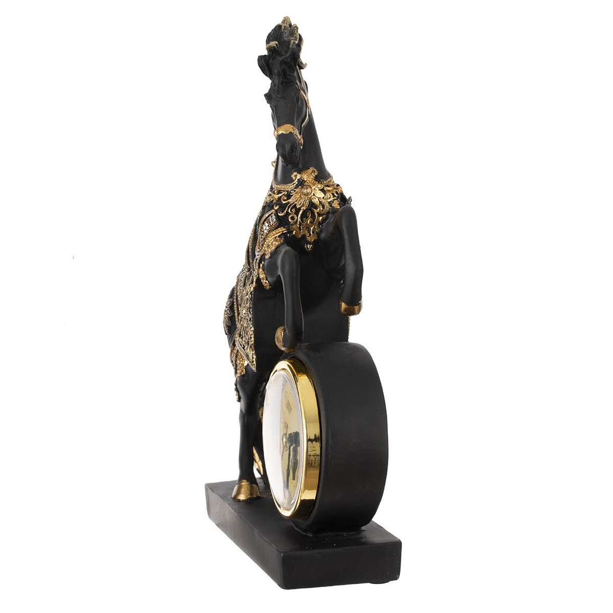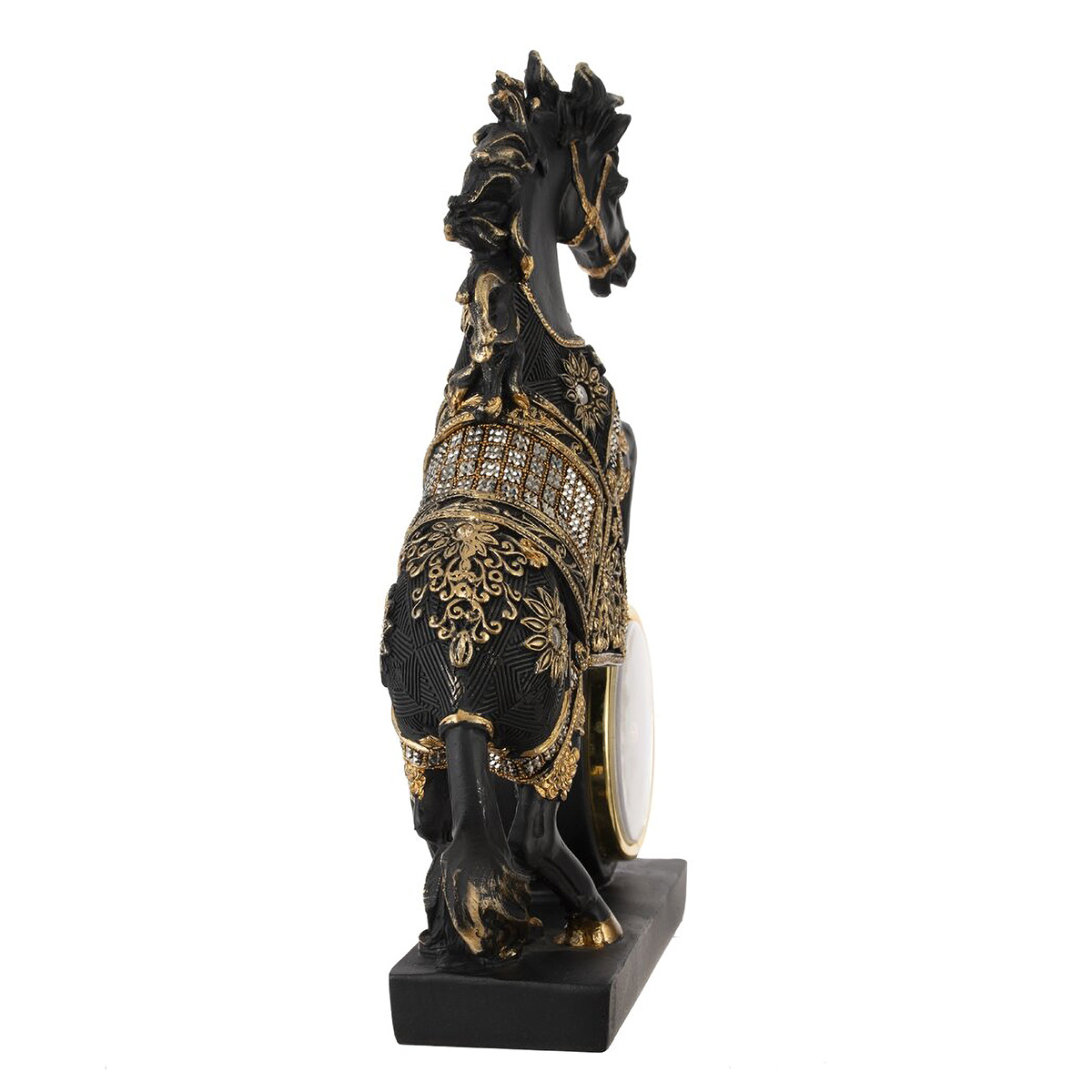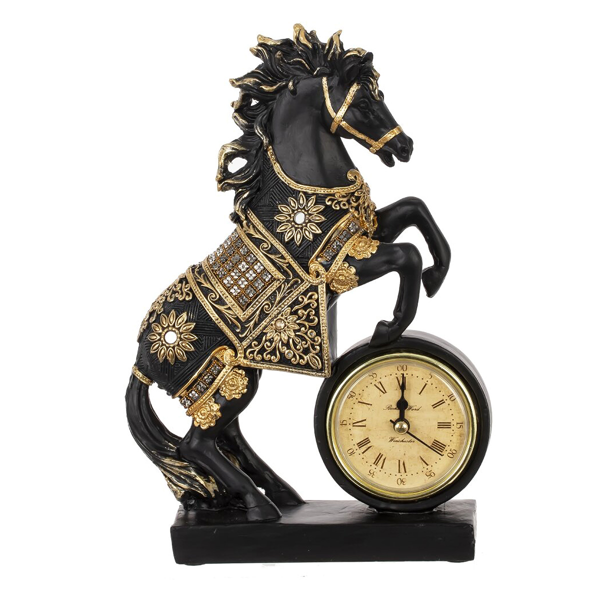 824464Фигурка декоративная "Лошадь" с часами [AAAx1,н/п], L15 W5 H22 смДекоративная фигурка "Лошадь" с часами — это изысканный и функциональный акцент для вашего интерьера, сочетающий элегантность и практичность! Выполнена из прочного полистоуна, устойчивого к царапинам и пыли. Установлена на подставке. Фигурка изображает реалистичную черную лошадь в динамичной позе курбет [на задних ногах], с высокой детализацией: мускулистое тело, выразительная морда, развивающаяся грива и хвост, словно ожившие под ветром. Нарядная попона украшена изысканным золотым узором, придающим праздничный шарм. Круглые часы с диаметром циферблата 6 см имеют римские цифры и работают от одной батарейки ААА [батарейки не прилагаются]. Это практичный подарок как символ года Лошади, идеальный для коллекционеров, любителей лошадей и ценителей стильного декора. Прекрасно дополнит полку, стол или витрину, принося нотку грации и функциональности в любое пространство!