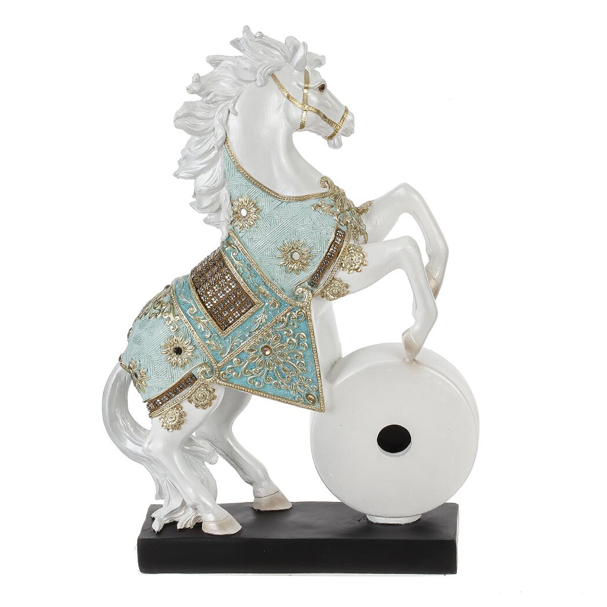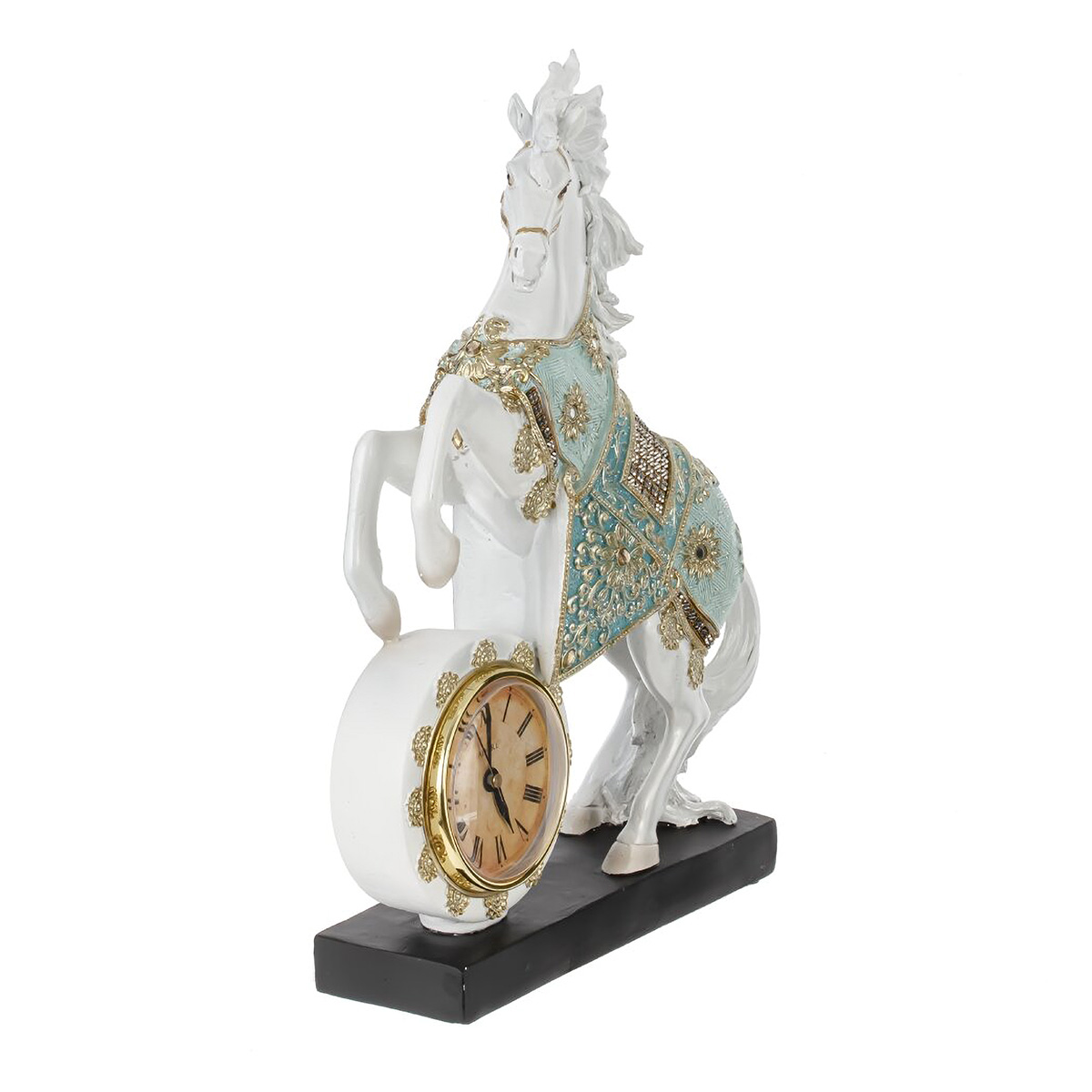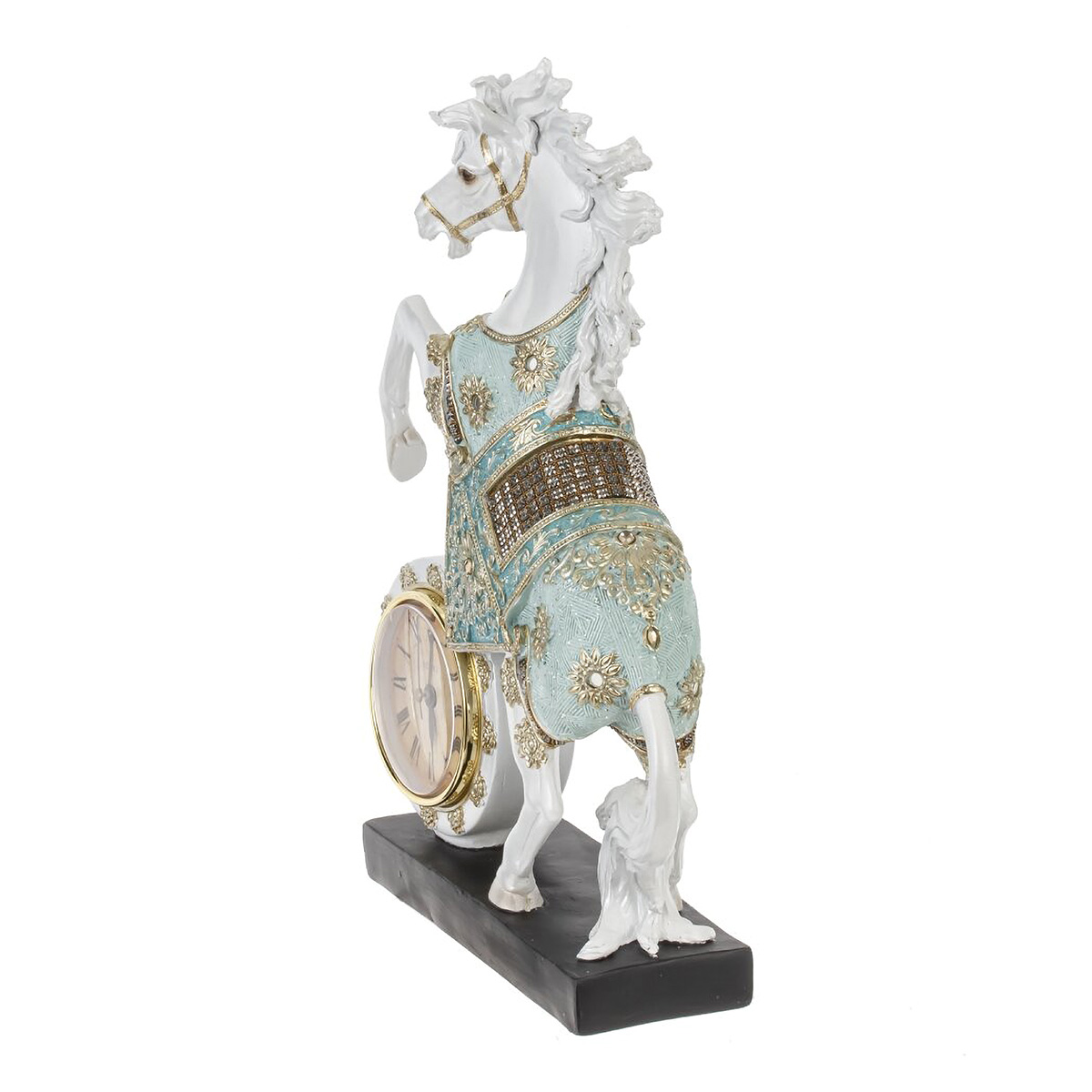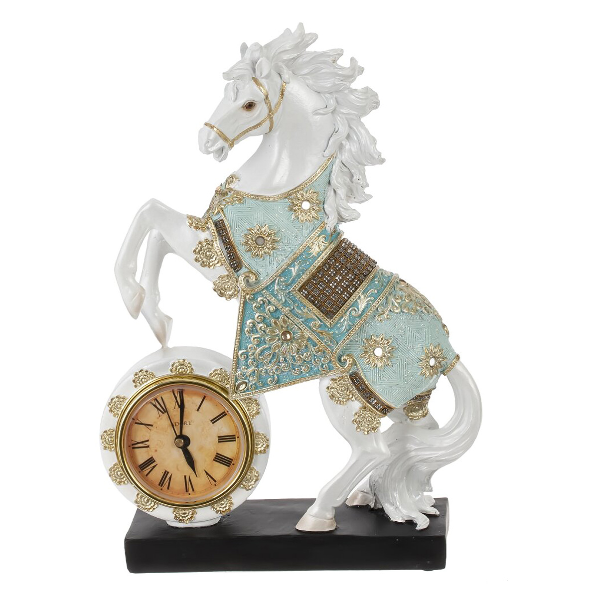 824466Фигурка декоративная "Лошадь" с часами [AAx1,н/п], L23 W7 H33 смДекоративная фигурка "Лошадь" с часами — это изысканный и функциональный акцент для вашего интерьера, сочетающий элегантность и практичность! Выполнена из прочного полистоуна, устойчивого к царапинам и пыли. Установлена на подставке. Фигурка изображает реалистичную белую лошадь в динамичной позе курбет [на задних ногах], с высокой детализацией: мускулистое тело, выразительная морда, развивающаяся грива и хвост, словно ожившие под ветром. Нарядная бирюзовая попона украшена изысканным золотым узором, придающим праздничный шарм. Круглые часы с диаметром циферблата 7 см имеют римские цифры и работают от одной батарейки АА [батарейки не прилагаются]. Это практичный подарок как символ года Лошади, идеальный для коллекционеров, любителей лошадей и ценителей стильного декора. Прекрасно дополнит полку, стол или витрину, принося нотку грации и функциональности в любое пространство!