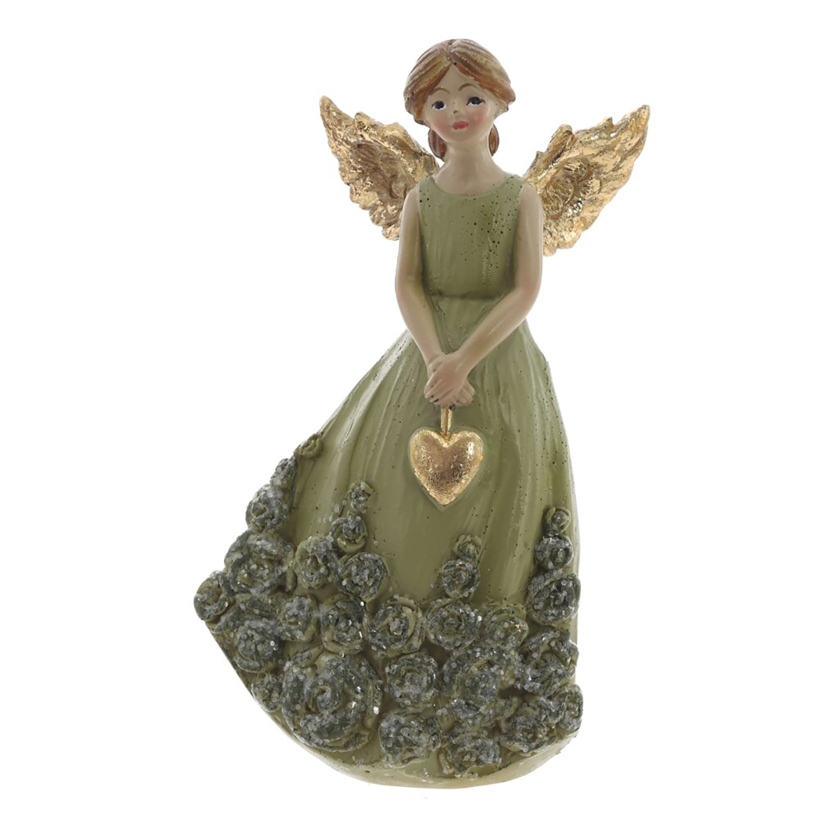 824994Фигурка декоративная "Ангел", L5 W3,5 H9 см, 2в.Декоративная фигурка «Ангел» из полимерных материалов выполнена в зеленой гамме. Нежная девочка?ангел в длинном алом платье держит в ладонях золотое сердечко. Низ платья украшен объемными розами с мерцающими акцентами, крылья покрыты золотистым напылением. Приятно прорисованы черты лица и волосы, силуэт изящный и устойчивый. Такая фигурка станет выразительным акцентом на полке, каминной полке или праздничном столе, добавит интерьеру романтики и уюта. Подойдет для подарка ко Дню всех влюбленных, Рождеству, дню рождения или просто в знак внимания близким. Представлено в двух вариантах.