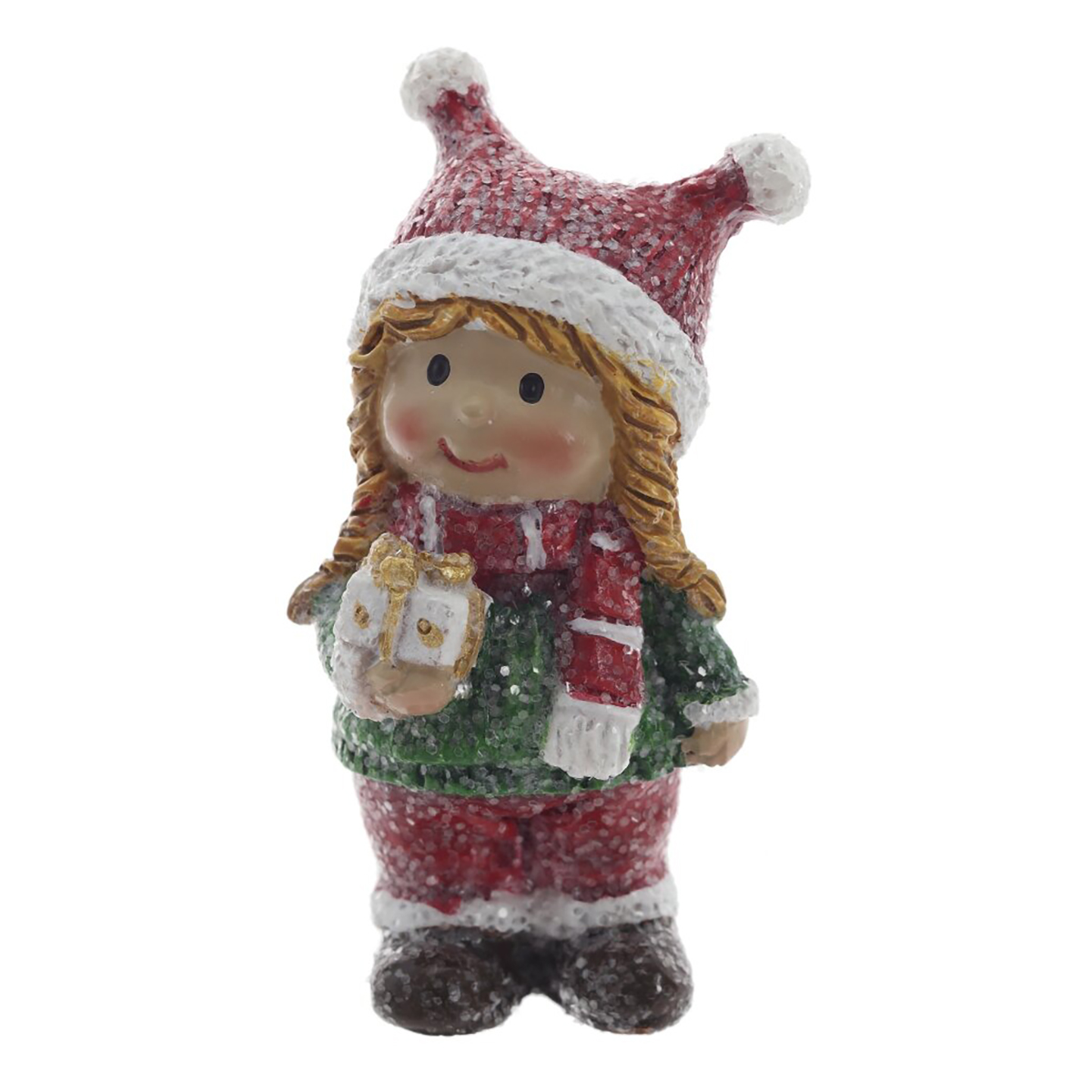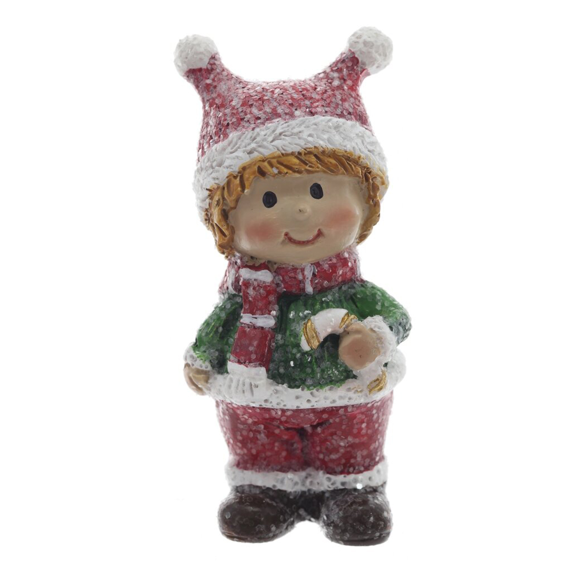 825056Фигурка декоративная "Дети", L2 W2,5 H6 см, 2в.Декоративная фигурка из полимерных материалов, выполненная в виде милого зимнего персонажа. Малыш в вязаной шапочке с двумя помпонами, в шарфике и свитере, теплых штанишках и ботинках. На лице мягкая улыбка и румяные щечки, в руке — леденец-петля с золотистыми акцентами. Поверхность имеет легкую «снежную» фактуру, создающую эффект инея. Компактная и устойчивая, фигурка станет уютным акцентом на полке, каминной полке или рабочем столе, подойдет для новогодних композиций, подарочных наборов и зимнего декора дома. Полимер прочный, детали аккуратно прорисованы, цвета нежные и праздничные. Представлено в двух вариантах.