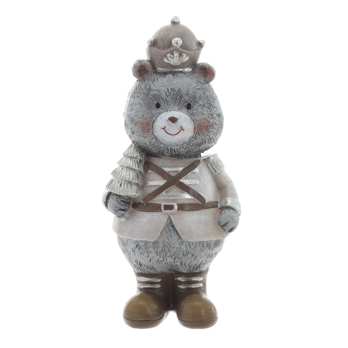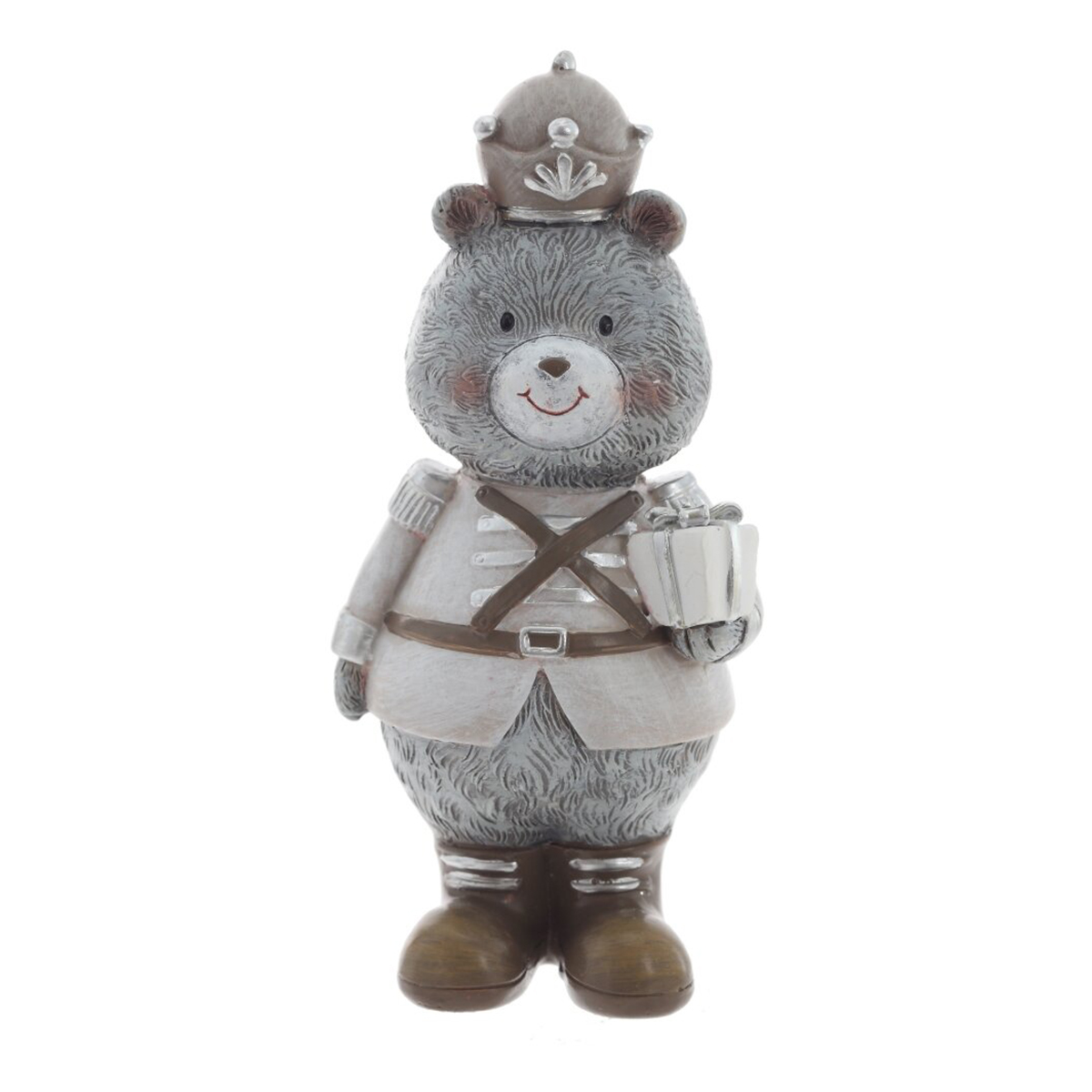 825124Фигурка декоративная "Медвежонок", L6 W5,5 H13,5 см, 2в.Декоративная фигурка из полимерных материалов в виде очаровательного медвежонка в парадной форме. Он одет в мундир с серебряными погонами и манжетами, на голове фуражка с декоративным элементом, на ногах сапоги с аккуратными полосками. В лапках медвежонок держит небольшой подарок, перевязанный лентой. Мягкие черты мордочки, румянец и аккуратная роспись придают образу доброжелательное, праздничное настроение. Фигурка легкая, устойчиво стоит на ровной поверхности и станет милым акцентом для новогоднего и всесезонного оформления полки, каминной полки, стола или детской. Отличный сувенир для коллекционеров и поклонников сказочных персонажей, не требует особого ухода — достаточно бережно протирать от пыли сухой салфеткой. Представлено в двух вариантах.