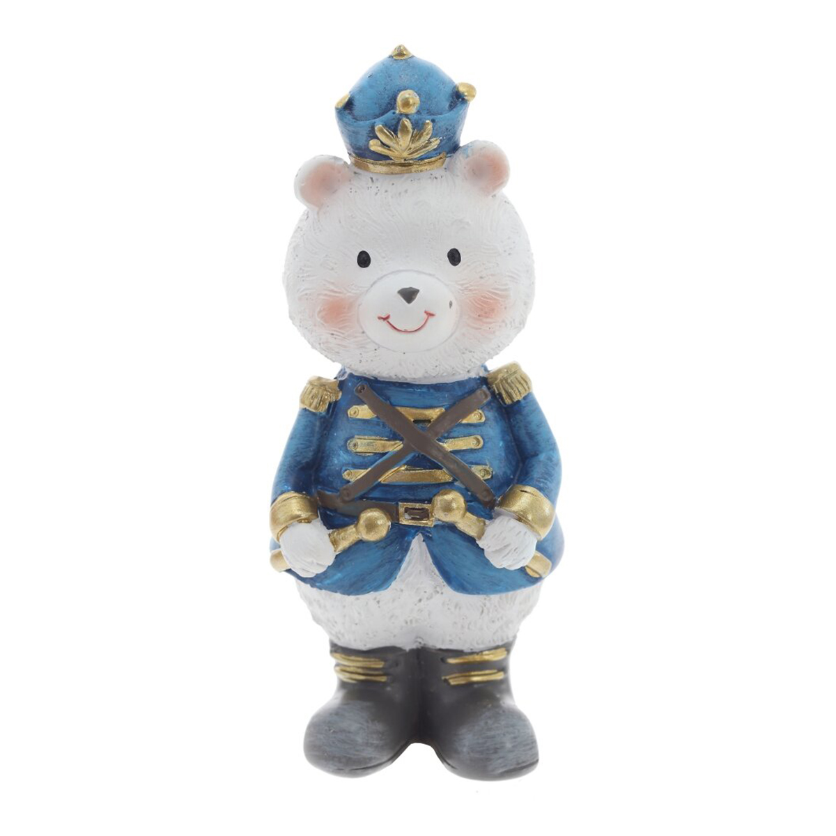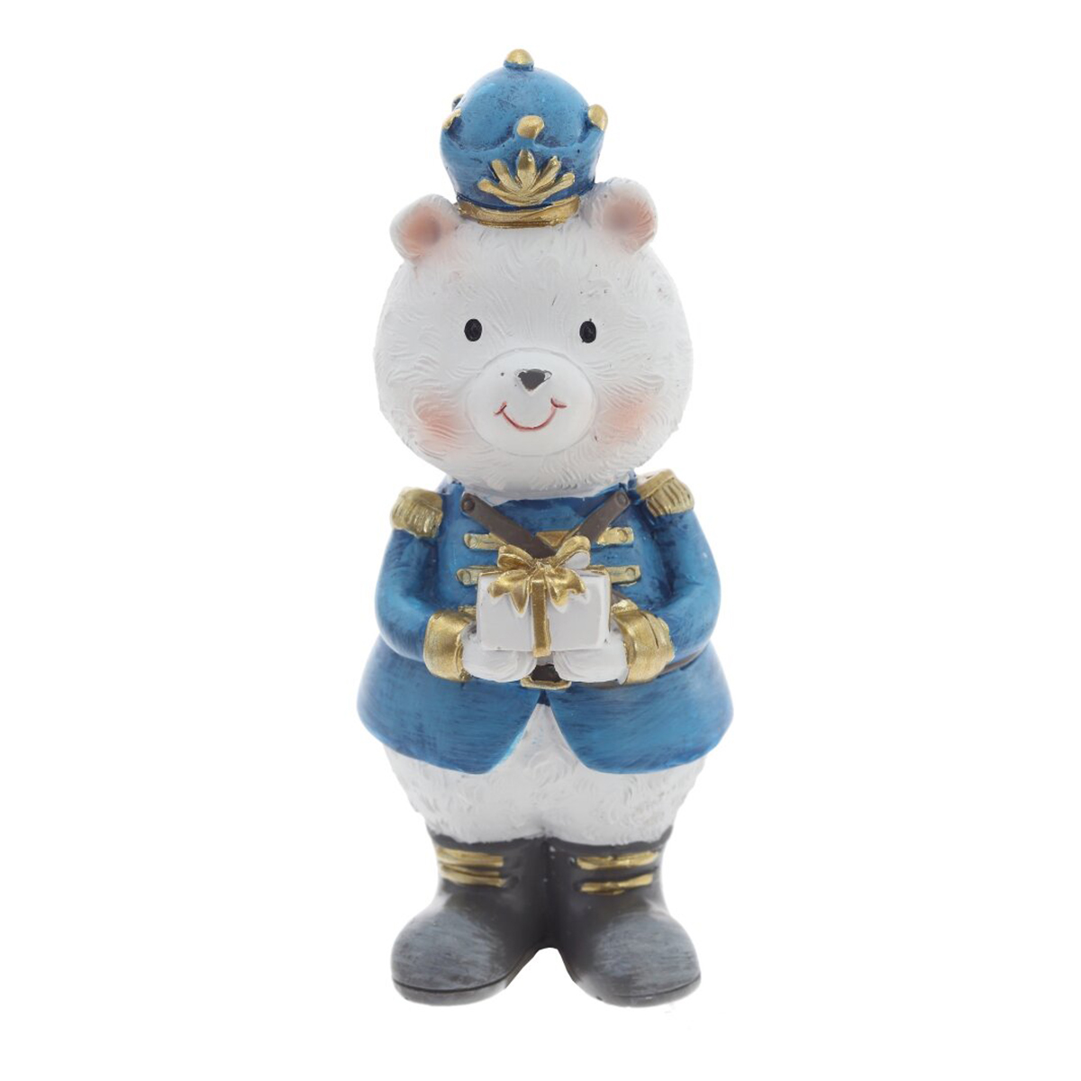 825127Фигурка декоративная "Медвежонок", L4 W4 H10 см, 2в.Декоративная фигурка из полимерных материалов в виде очаровательного медвежонка в парадной форме. Он одет в мундир с золотыми погонами и манжетами, на голове фуражка с декоративным элементом, на ногах сапоги с аккуратными полосками. В лапках медвежонок держит небольшой подарок, перевязанный лентой. Мягкие черты мордочки, румянец и аккуратная роспись придают образу доброжелательное, праздничное настроение. Фигурка легкая, устойчиво стоит на ровной поверхности и станет милым акцентом для новогоднего и всесезонного оформления полки, каминной полки, стола или детской. Отличный сувенир для коллекционеров и поклонников сказочных персонажей, не требует особого ухода — достаточно бережно протирать от пыли сухой салфеткой. Представлено в двух вариантах.