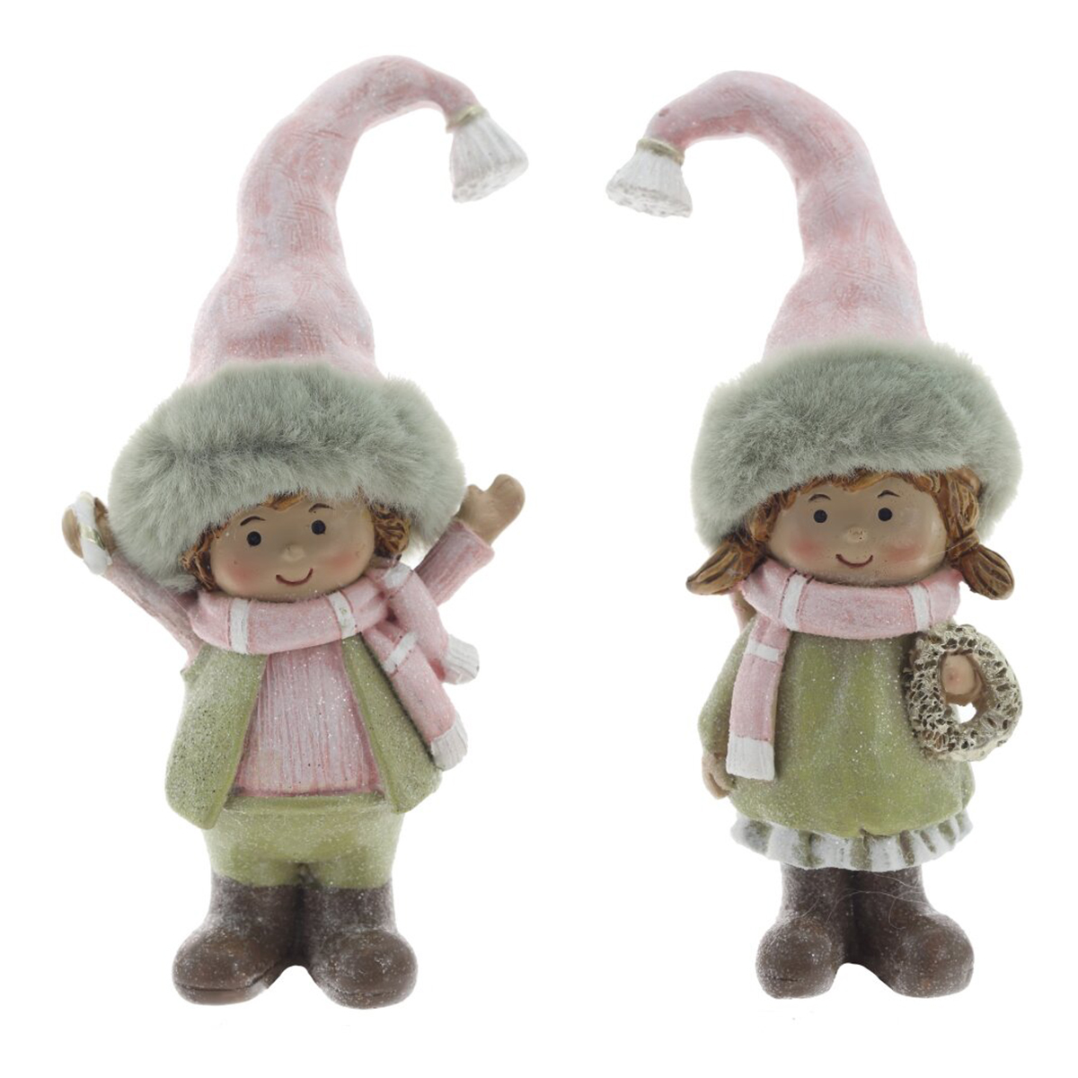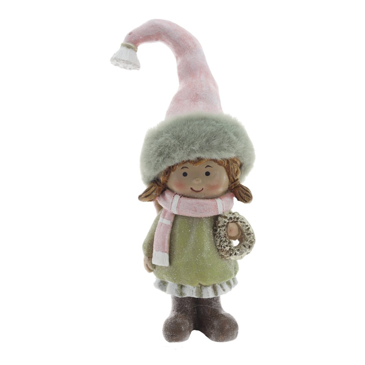 825225Фигурка декоративная "Дети", L6 W5 H13 см, 2в.Декоративная фигурка из полимерных материалов, выполненная в виде милой зимней девочки. Персонаж одет в нежно?зелёное платье с белой оборкой, на ногах коричневые сапожки. На голове пушистая шапка с меховым краем и высокий розовый колпак с кисточкой, к которому в тон подобран розово?белый шарфик. Девочка держит в руке миниатюрный веночек, поверхность изделия местами покрыта «снежинками», создающими эффект лёгкого инея. Тщательная ручная проработка деталей — косички, текстура меха и складки одежды — придают фигурке тепло и выразительность. Стабильное основание позволяет уверенно ставить её на полку, камин или под ёлку. Идеальна для зимнего и новогоднего декора дома, офиса или витрины, станет приятным подарком и добавит уютной сказочности любому интерьеру. Представлено в двух вариантах.