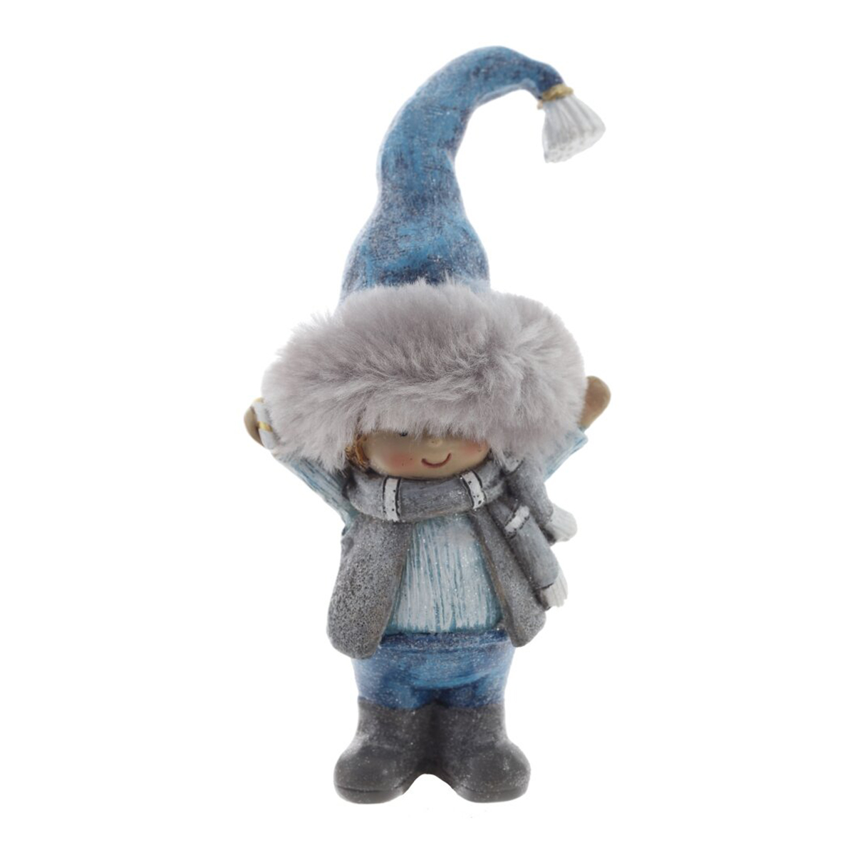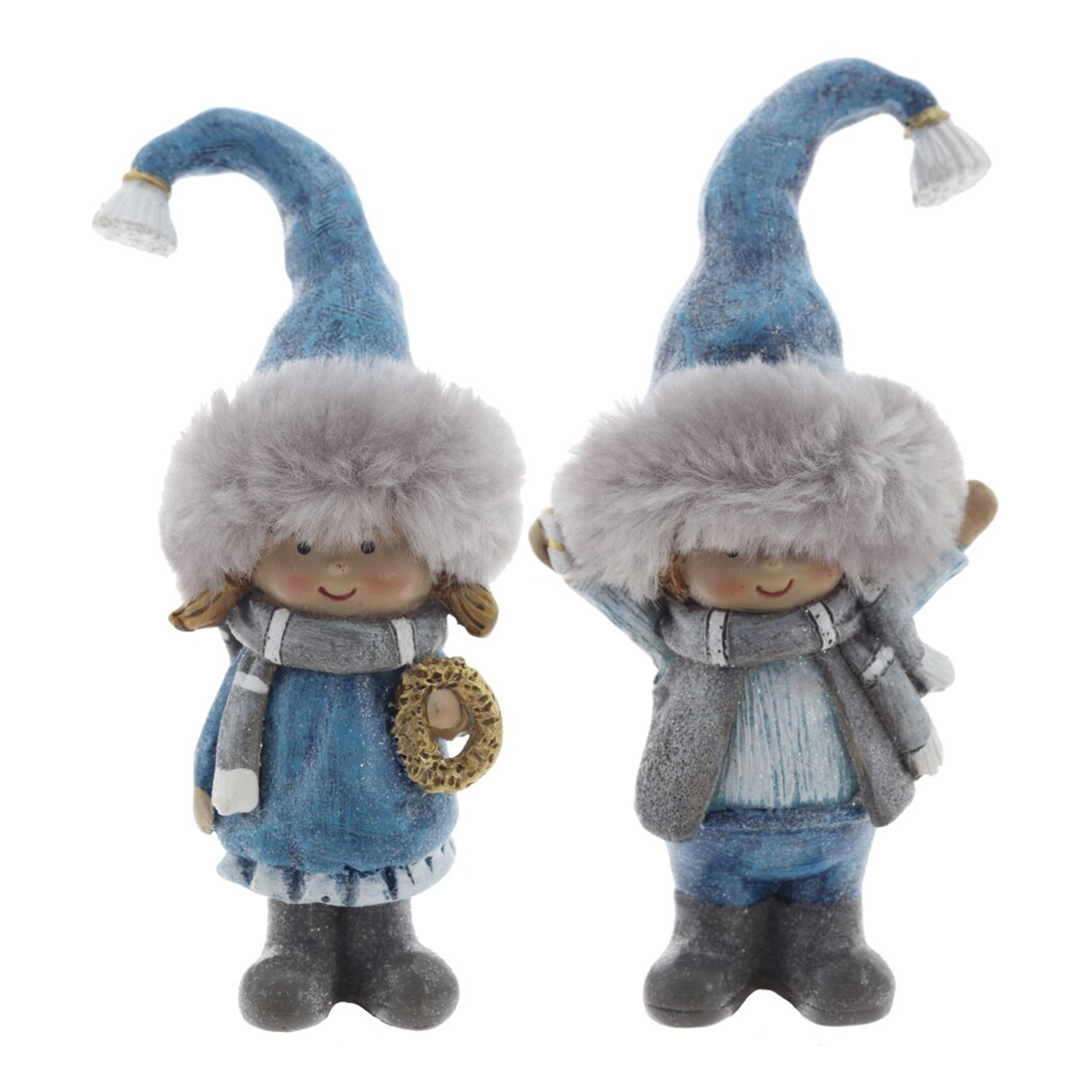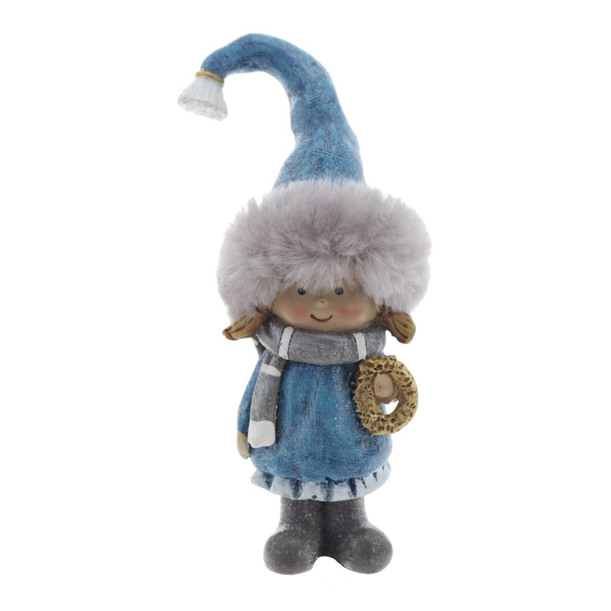 825226Фигурка декоративная "Дети", L6 W5 H13 см, 2в.Декоративная фигурка из полимерных материалов, выполненная в виде милой зимней девочки. Персонаж одет в нежно?голубом платье с белой оборкой, на ногах серые сапожки. На голове пушистая шапка с меховым краем и высокий голубой колпак с кисточкой, к которому в тон подобран серый шарфик. Девочка держит в руке миниатюрный веночек, поверхность изделия местами покрыта «снежинками», создающими эффект лёгкого инея. Тщательная ручная проработка деталей — косички, текстура меха и складки одежды — придают фигурке тепло и выразительность. Стабильное основание позволяет уверенно ставить её на полку, камин или под ёлку. Идеальна для зимнего и новогоднего декора дома, офиса или витрины, станет приятным подарком и добавит уютной сказочности любому интерьеру. Представлено в двух вариантах.