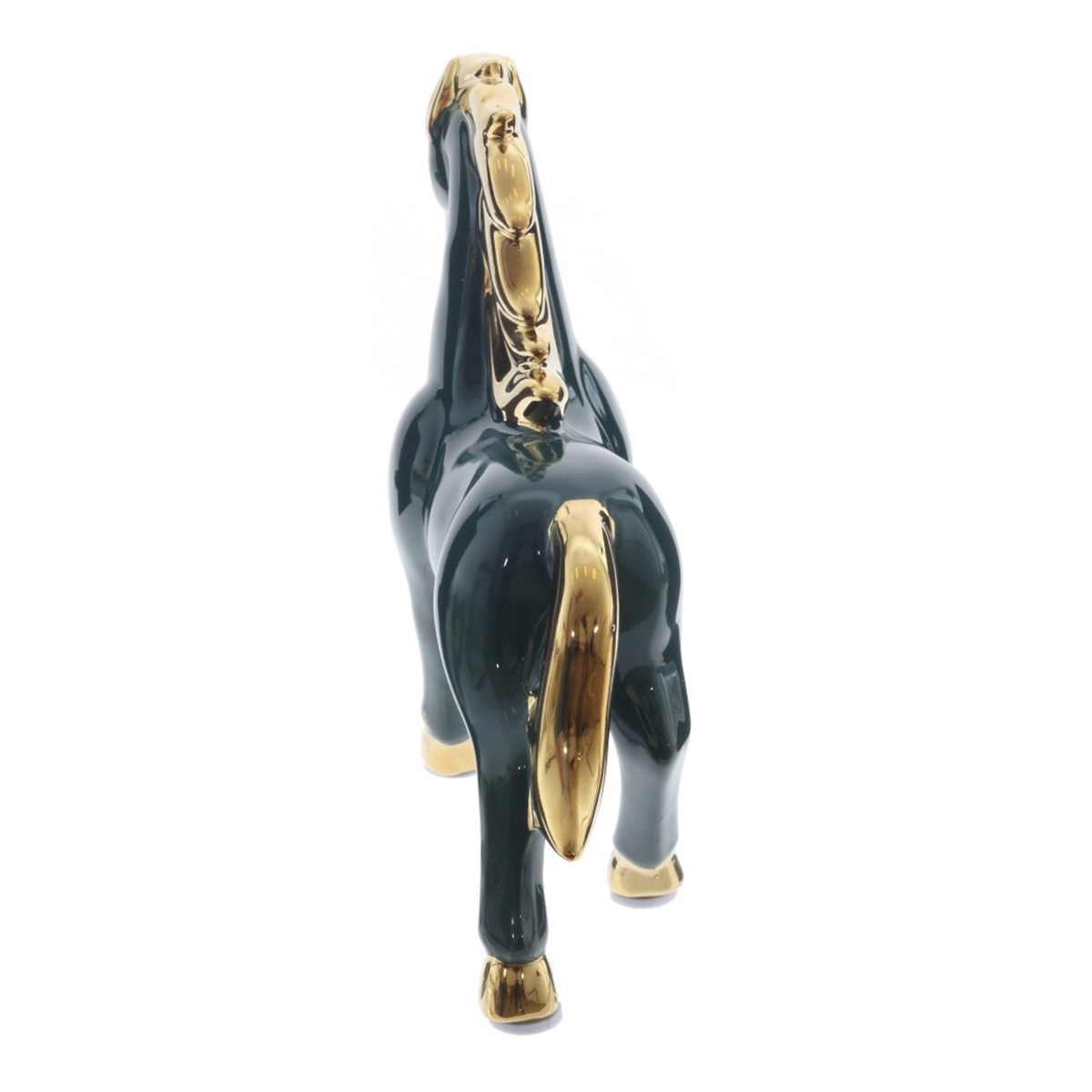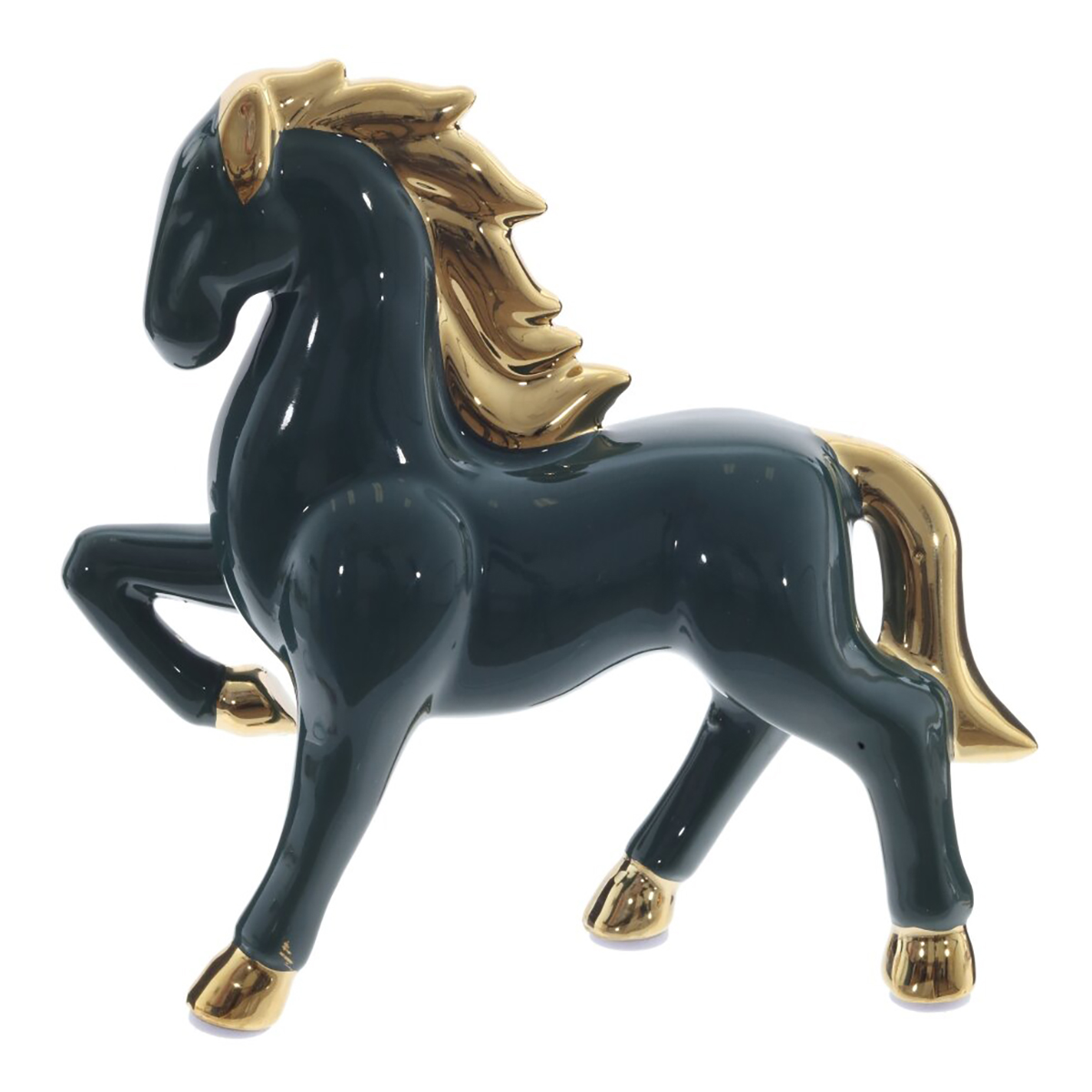 825304Фигурка декоративная "Лошадь", L15 W4 H15 смДекоративная фигурка «Лошадь» из керамики станет выразительным акцентом в интерьере и удачным подарком. Гладкая зеркальная глазурь благородного темно-изумрудного оттенка эффектно сочетается с золотистыми акцентами на гриве, хвосте и копытах. Динамичная поза с приподнятой ногой подчеркивает энергию, силу и стремление вперед, а золотой блеск символизирует достаток и успех. Лошадь традиционно считается покровительницей удачи и вдохновения, поэтому фигурка подойдет для рабочего кабинета, гостиной или прихожей, а также как талисман и символ года по восточному календарю. Устойчивая, легко очищается от пыли и долго сохраняет безупречный вид.