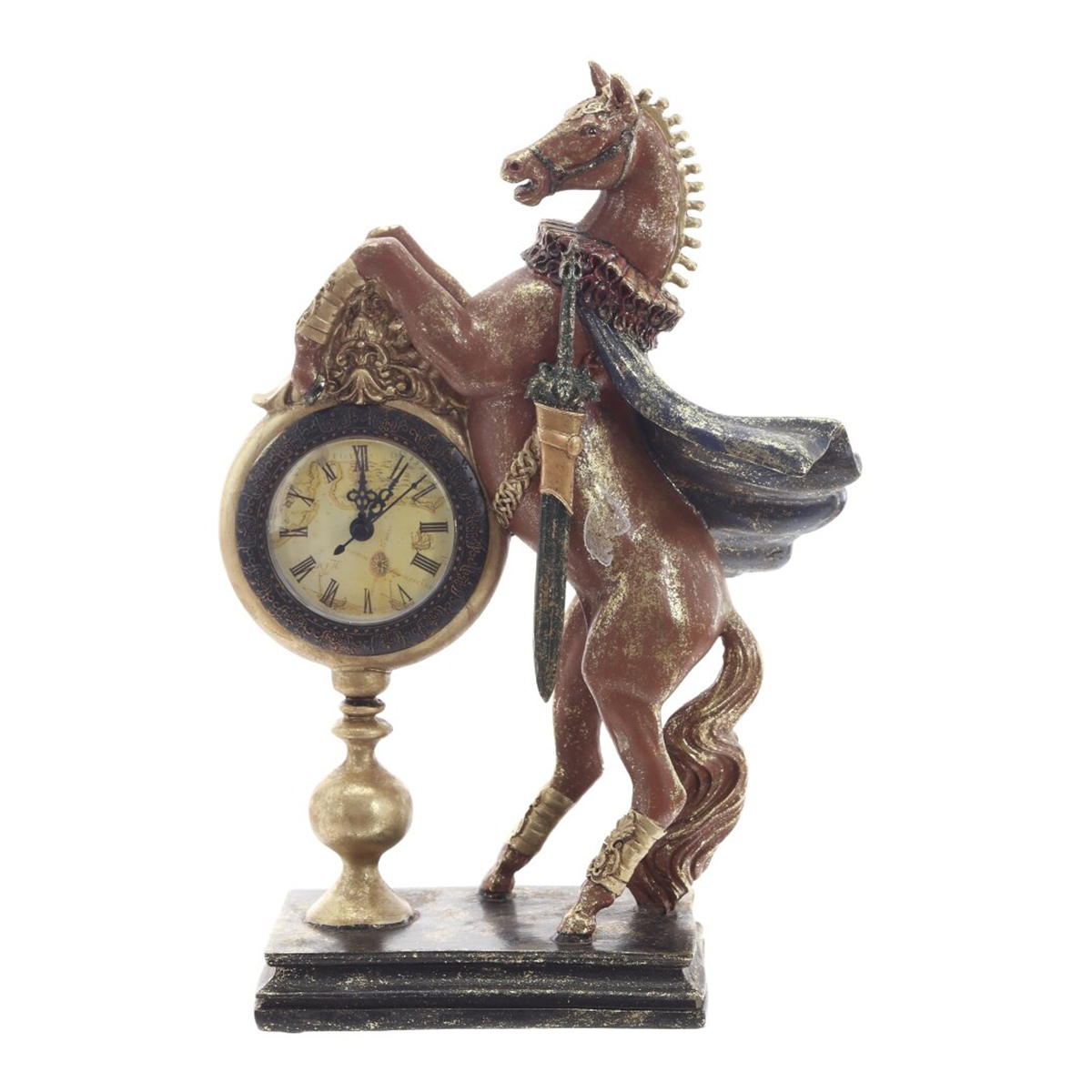 825409Фигурка декоративная "Лошадь" с часами D7см, [AAx1 н/п], L24 W9,5 H34,5 смДекоративная фигурка "Лошадь" с часами — стильный и символичный элемент декора, который станет прекрасным подарком к Новому году или талисманом на удачу. Выполненная из прочного полимерного материала, фигурка символизирует энергию, силу и процветание. Лошадь традиционно ассоциируется с удачей и успехом в делах. Идеально подойдёт для оформления интерьера дома или офиса, а также станет оригинальным дополнением к новогодней композиции. Этот стильный сувенир будет радовать вас и ваших близких.
