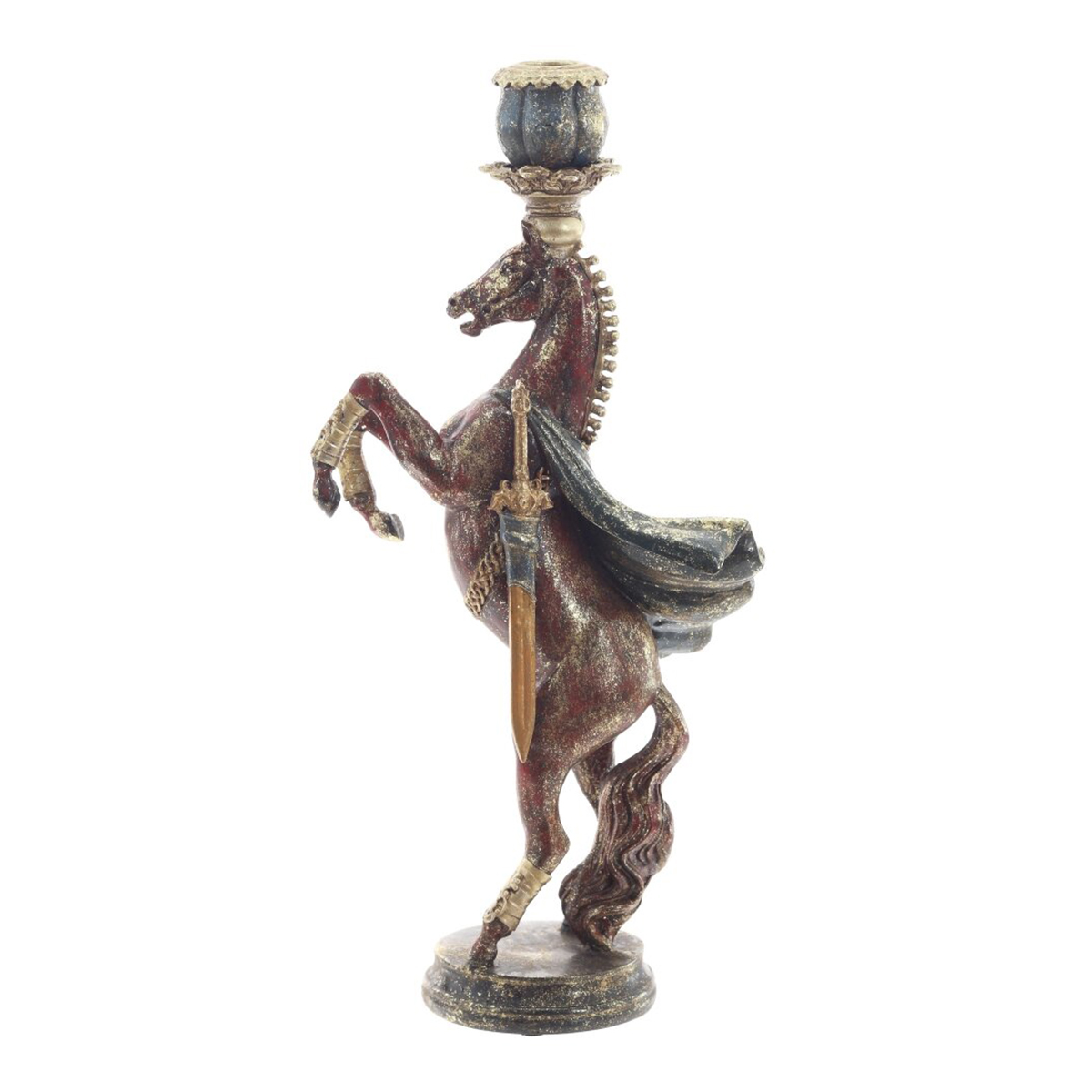 825414Подсвечник "Лошадь", L14 W9 H36 смПодсвечник «Лошадь» — эффектный интерьерный акцент из полимерных материалов с художественной окраской под старую бронзу и золото. Фигура лошади на круглом постаменте передает динамику и силу; гриву и сбрую подчеркивают золотистые детали, на боку — декоративный меч и развевающийся плащ. Сверху расположена изящная чашечка в виде бутона для установки тонкой столовой свечи. Символ года — лошадь — ассоциируется с удачей, уверенным движением вперед и благополучием, поэтому такой подсвечник станет удачным подарком на Новый год, день рождения или новоселье. Он органично впишется в классический, винтажный и эклектичный интерьер, украсит каминную полку, консоль или рабочий стол, создавая теплое вечернее освещение. Уход прост: протирайте мягкой сухой тканью; устанавливайте на ровную поверхность и не оставляйте горящую свечу без присмотра.