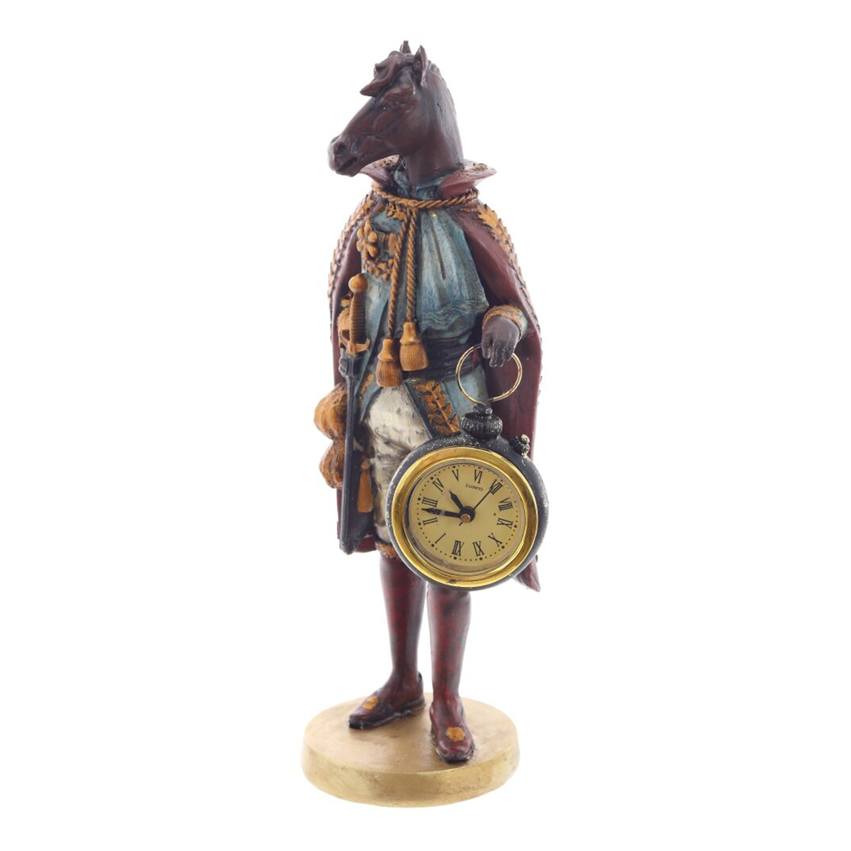 825427Фигурка декоративная "Лошадь" с часами D4см, [LR44x1], L12 W7,5 H24,5 смДекоративная фигурка «Лошадь» с часами — эффектный акцент для дома и удачный символ года. Скульптура изображает благородного персонажа с головой лошади в парадном наряде: камзол, плащ с тесьмой и кистями, тонкая имитация старинной отделки. В руке — винтажные часы-подвеска с круглым циферблатом D4 см и римскими цифрами. Изделие выполнено из прочных полимерных материалов, детали тщательно проработаны, окраска с лёгкой патиной. Конструкция устойчива благодаря круглой подставке. Часы работают от одной батарейки LR44 [1 шт.]. Фигурку удобно разместить на полке, камине или рабочем столе. Оригинальный подарок и стильный талисман, приносящий энергию и удачу года Лошади.