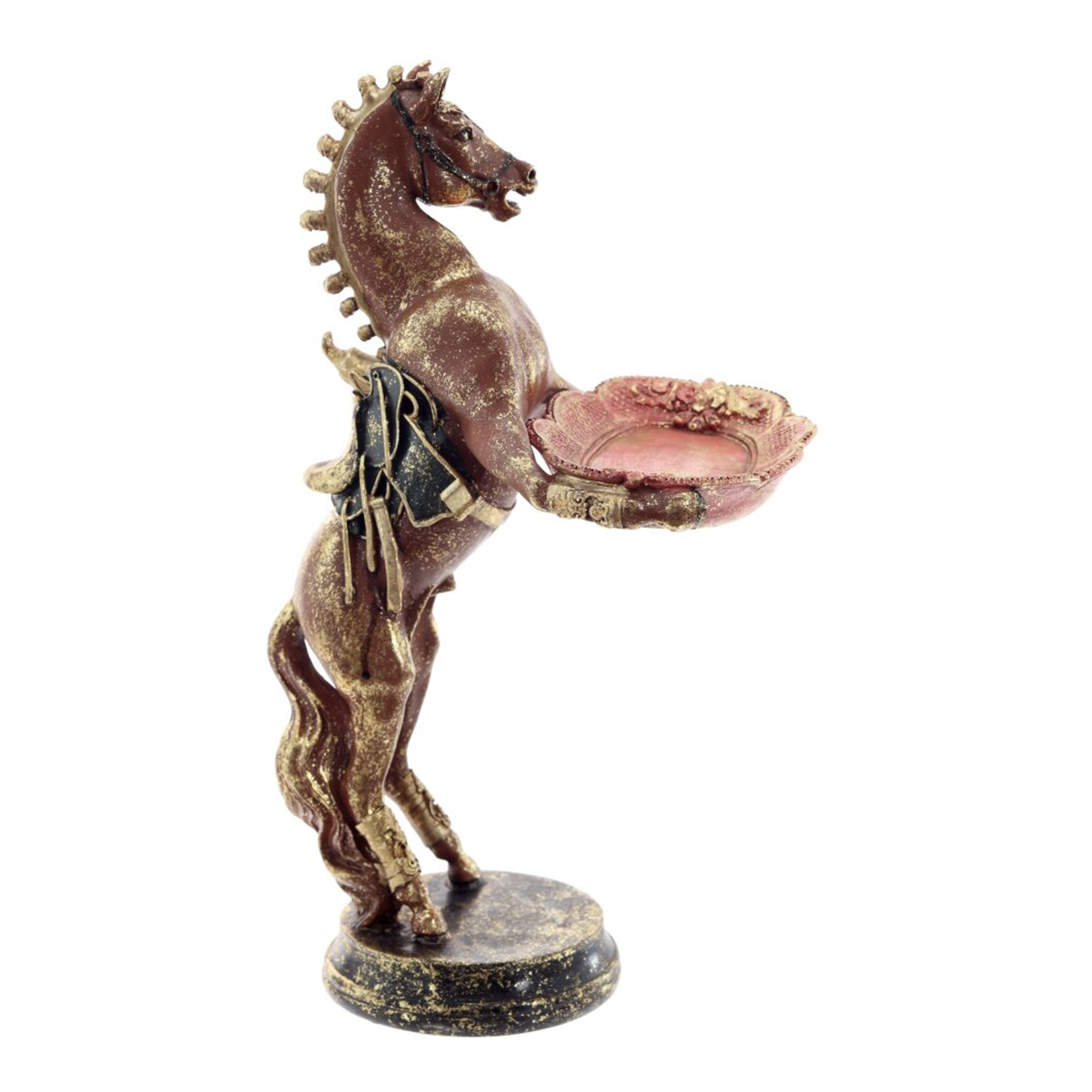825436Фигурка декоративная "Лошадь", L15,5 W17,5 H30,5 смДекоративная фигурка «Лошадь» из полимерных материалов выполнена в виде грациозного коня на дыбах, который передними ногами поддерживает изящную чашу?подставку. Корпус окрашен в теплые коричнево?бордовые тона с выразительной золотой патиной под старину, седло и упряжь детально проработаны. Круглый постамент обеспечивает устойчивость. Чаша с рельефным декором подойдет для украшений, мелочи, ключей или небольшой свечи. Фигурка станет ярким акцентом интерьера в классическом или винтажном стиле и отличным подарком. Как символ года лошадь привнесет в дом энергию движения, удачу и достаток. Легкая, прочная, проста в уходе.