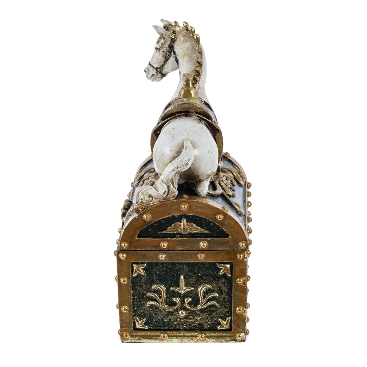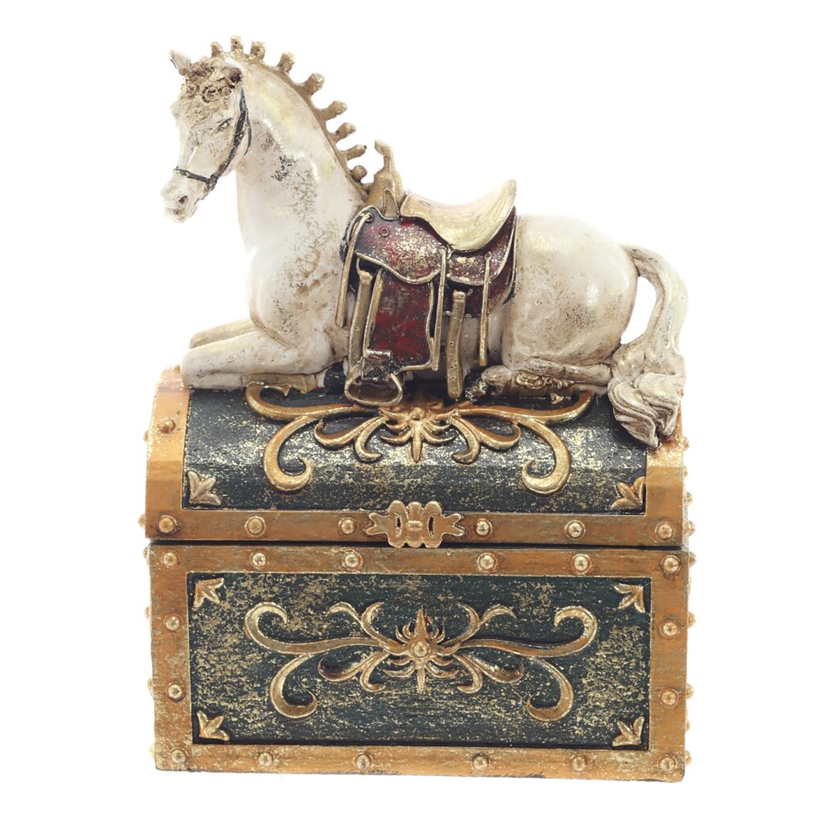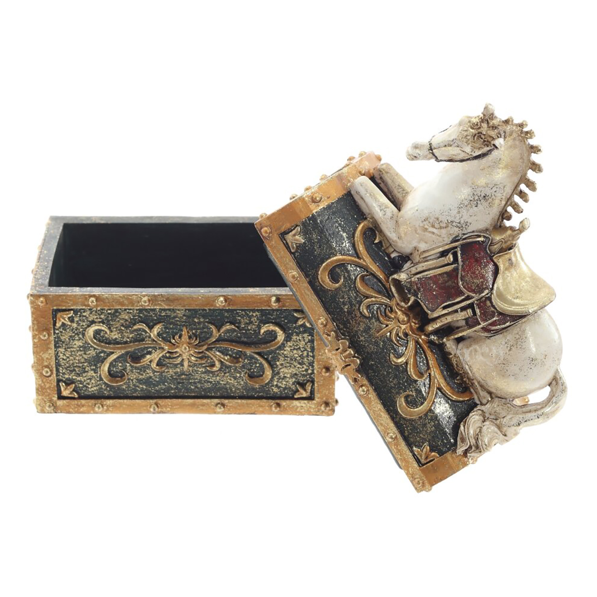 825438Шкатулка "Лошадь", L14,5 W9 H20 смДекоративна шкатулка, декорированная фигуркой лошади на крышке — это изящный и стильный аксессуар, который украсит любой интерьер и добавит ему нотку благородства. Выполненный в благородном цвете, он отличается утончённым дизайном и гармоничными линиями, олицетворяющими грацию и силу этого благородного животного. Лошадь — символ энергии, стремления вперёд и удачи, а потому такой элемент декора может стать не только украшением, но и талисманом для дома. Это стильное изделие украсит полку, камин, туалетный столик или станет оригинальным подарком. Его можно использовать как самостоятельный элемент декора или в сочетании с другими аксессуарами в едином стиле. Это сочетание красоты и символизма будет радовать глаз каждый день.