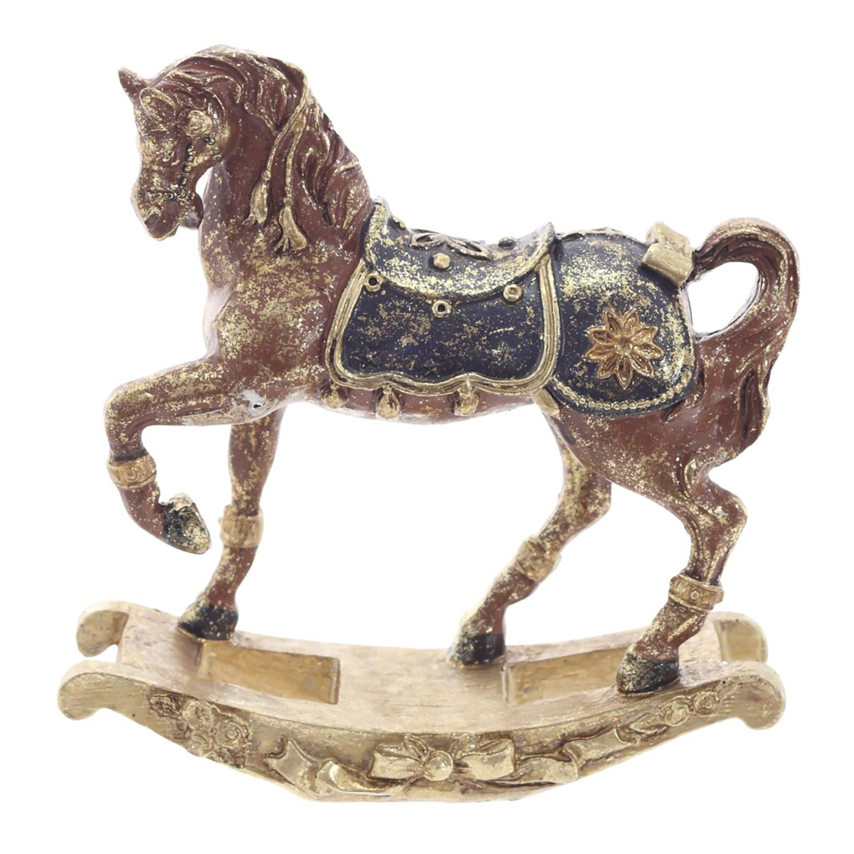 825441Фигурка декоративная "Лошадка-качалка", L16 W5,5 H16,5 смДекоративная фигурка «Лошадка-качалка» из полимерных материалов, выполненная в винтажной стилистике. Изящная поза с приподнятой ногой, темно-синее седло с золотыми акцентами и рельефным узором. Основание напоминает качалку с лепным бантом, покрытие с благородной патиной под старую бронзу. Легкая и устойчивая, безопасна для размещения на полке, под ёлкой или в витрине. Прекрасный подарок и выразительный элемент праздничной композиции: лошадь как символ года привносит энергию, удачу и вдохновение в дом.