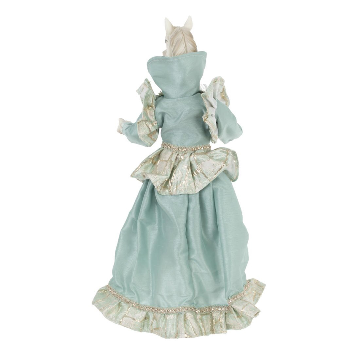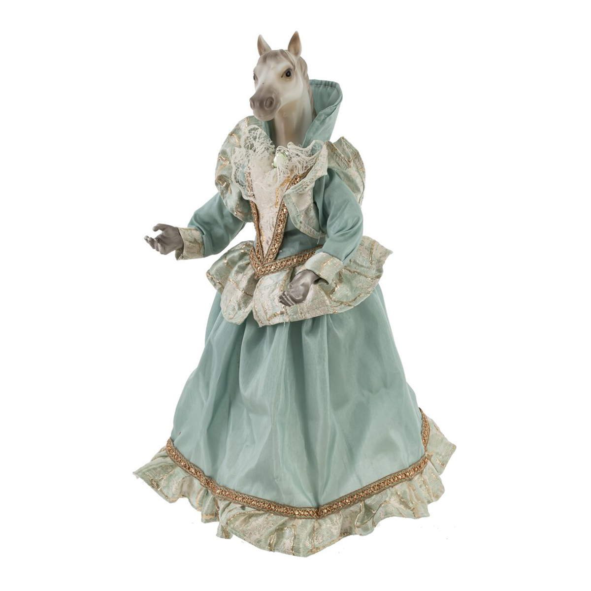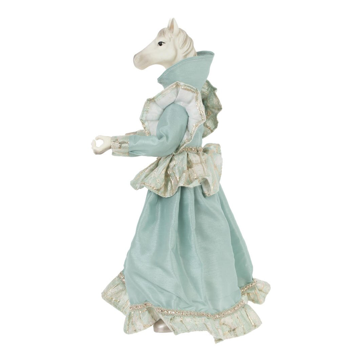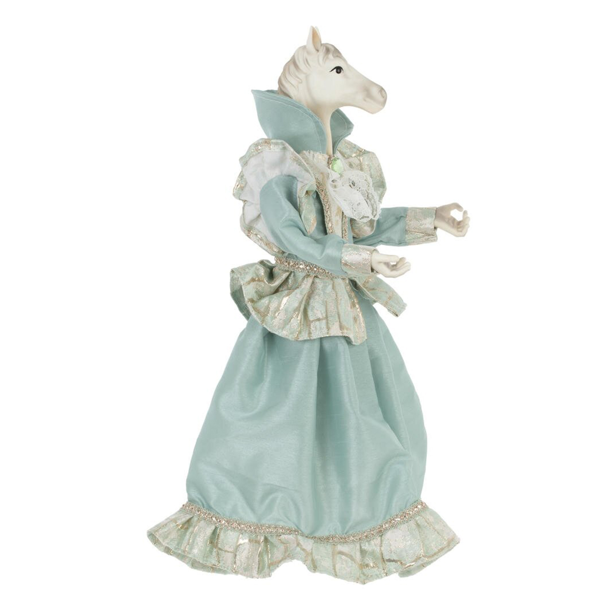 826043Игрушка набивная "Лошадь", L18 W11 H44 смНабивная игрушка «Лошадь» — эффектная интерьерная кукла. Персонаж одет в наряд придворной дамы: пышное платье цвета морской волны с широкой юбкой и оборкой по низу, парчовыми вставками и золотистым кантом. Лиф украшен кружевным жабо и декоративным камнем, воротник-стойка придаёт образу торжественность, а рукава с объёмными фонариками и баска подчёркивают силуэт. Аккуратные детали — от ушек и мордочки до «копытец» в манжетах — создают сказочное впечатление. Такая игрушка подойдёт для коллекции, оформления полки или витрины, станет необычным подарком любителям лошадей и атмосферного декора.