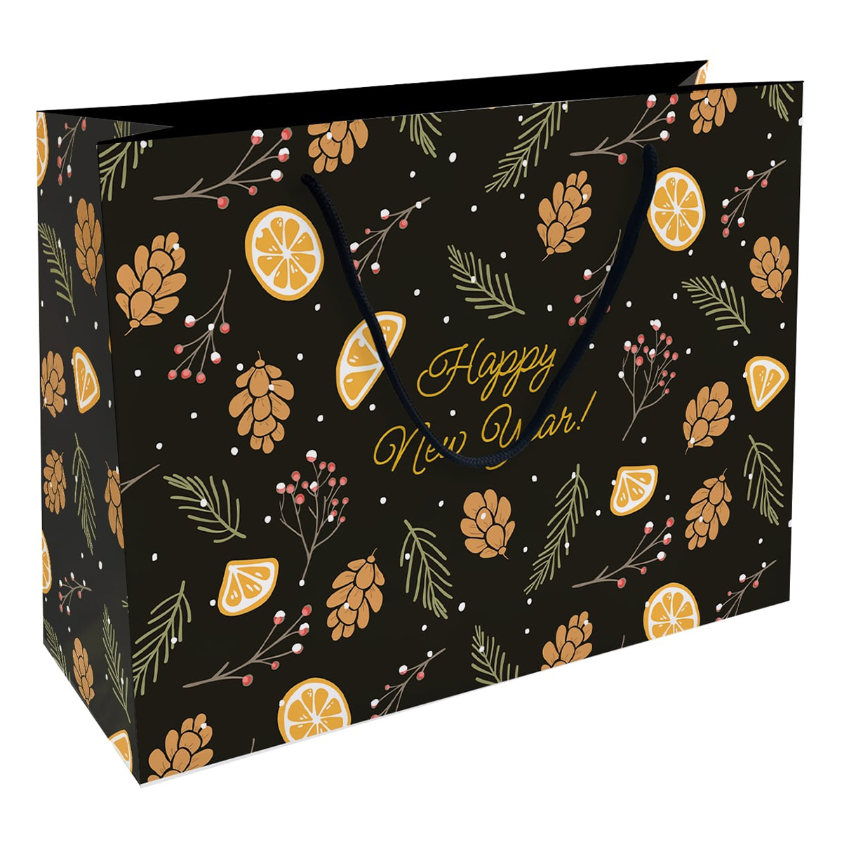 Пакет подарочный с подгибкой, с веревочными ручками. Пакет из картона 200 г/м2 с матовой ламинацией. Размер пакета 36*26 см с глубиной 12 см. Грузоподъемость 3-4 кг. Тематика: НГ.