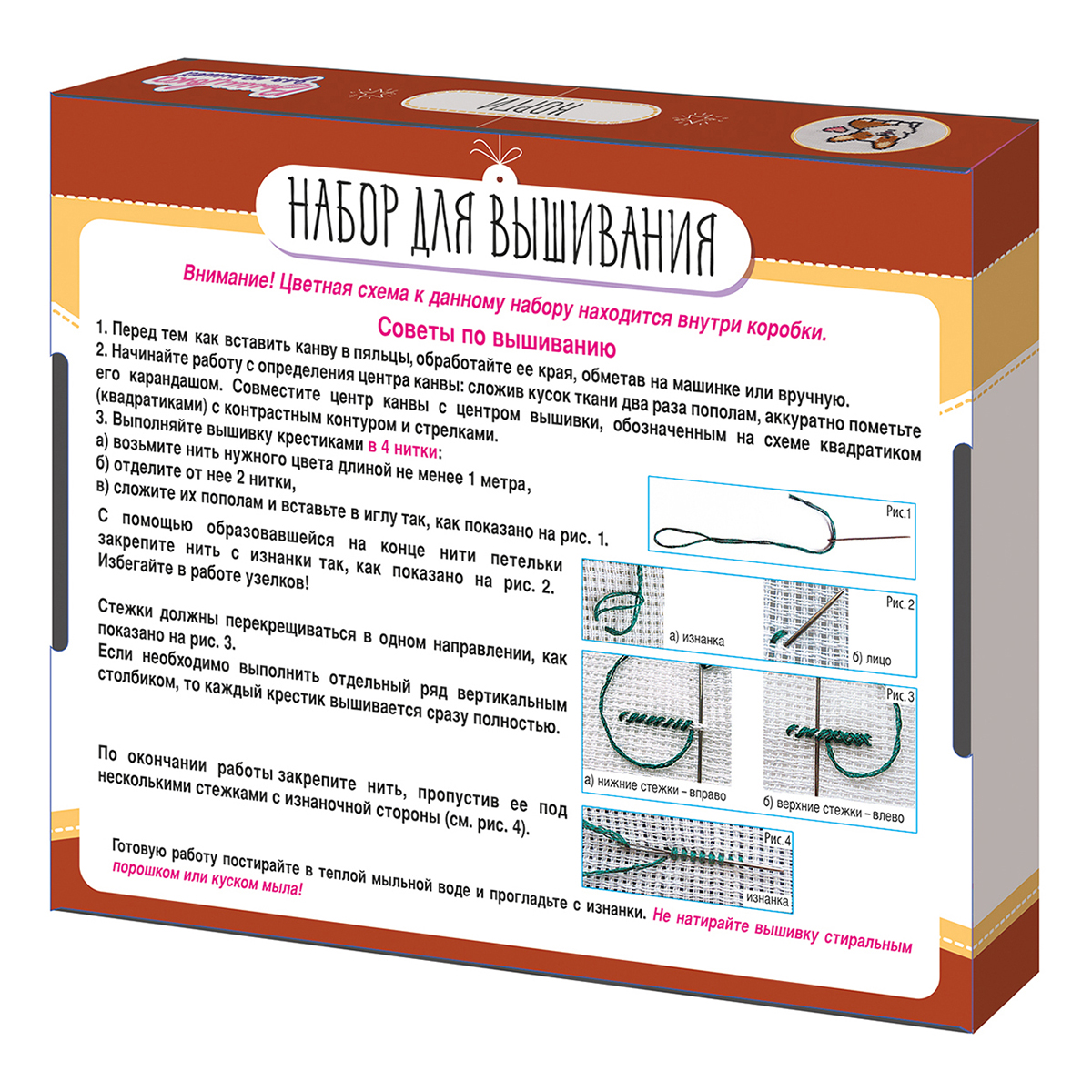 Размер готовой вышивки 10х10 см. Материалы: бумага, текстильный материал, полимерный материал. Набор рекомендован для детей старше 5 лет.
