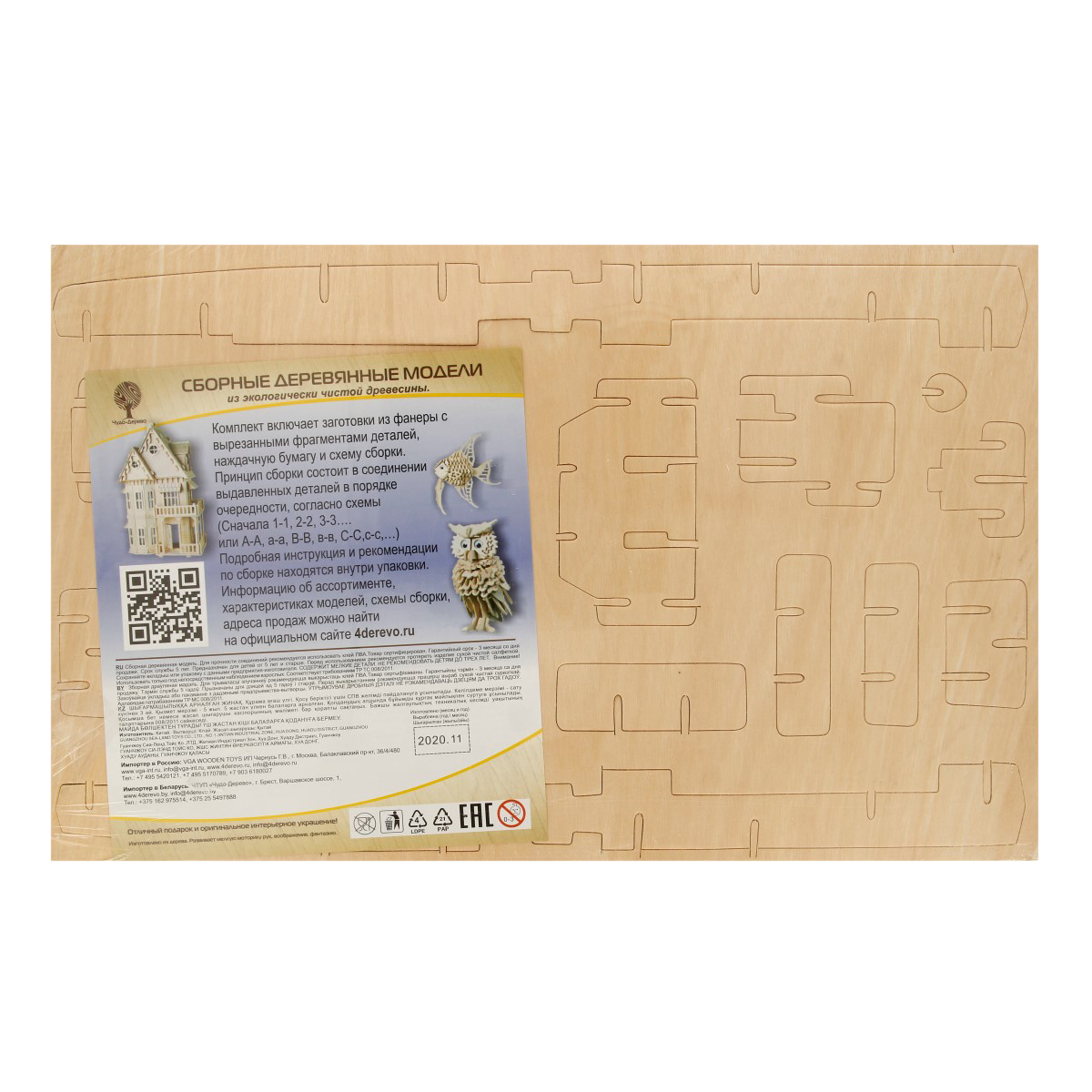 Сборная деревянная модель. Размер готовой модели, см – 50*12*21 Комплект включает в себя набор деталей, вырезанных на фанерных листах; схему сборки; наждачную бумагу. Детали скрепляются в порядке и очередности, обозначенной в инструкции. Для прочности соединений рекомендуется использовать клей ПВА. Собранную модель можно раскрасить или покрыть лаком. Лучший результат можно получить используя акриловые или темперные краски. Восстановить случайно сломанную в процессе сборки деталь легко с помощью клея ПВА. Для фиксации склеиваемых поверхностей можно использовать, например, обычную бельевую прищепку.