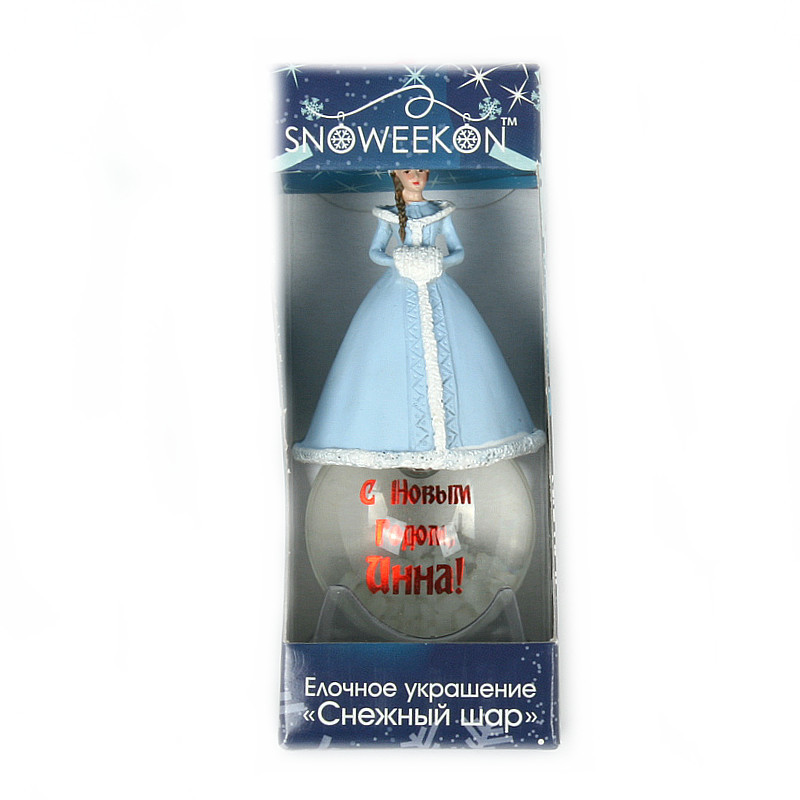 Снежный шар - прекрасный подарок на Новый год. Это отличный сюрприз, замечательное и необычное украшение новогодней елки. Снежный шар с макушкой в виде Снегурочки. Внутри шара - именная, поздравительная надпись, а также поздравительная надпись для мамы, бабушки, сестры.
