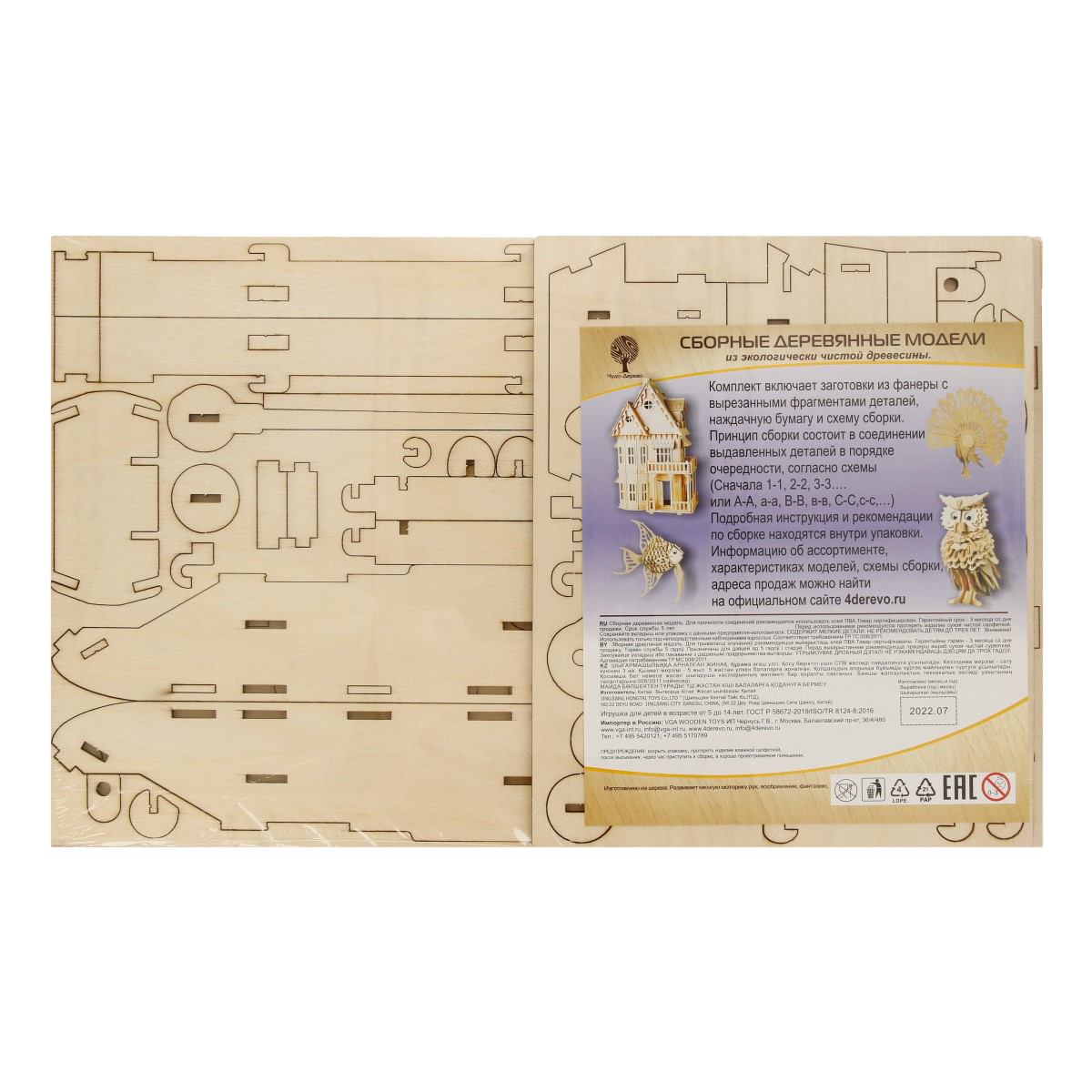 Сборная деревянная модель. Размер готовой модели, см – 30*12*12 Комплект включает в себя набор деталей, вырезанных на фанерных листах; схему сборки; наждачную бумагу. Детали скрепляются в порядке и очередности, обозначенной в инструкции. Для прочности соединений рекомендуется использовать клей ПВА. Собранную модель можно раскрасить или покрыть лаком. Лучший результат можно получить используя акриловые или темперные краски. Восстановить случайно сломанную в процессе сборки деталь легко с помощью клея ПВА. Для фиксации склеиваемых поверхностей можно использовать, например, обычную бельевую прищепку.