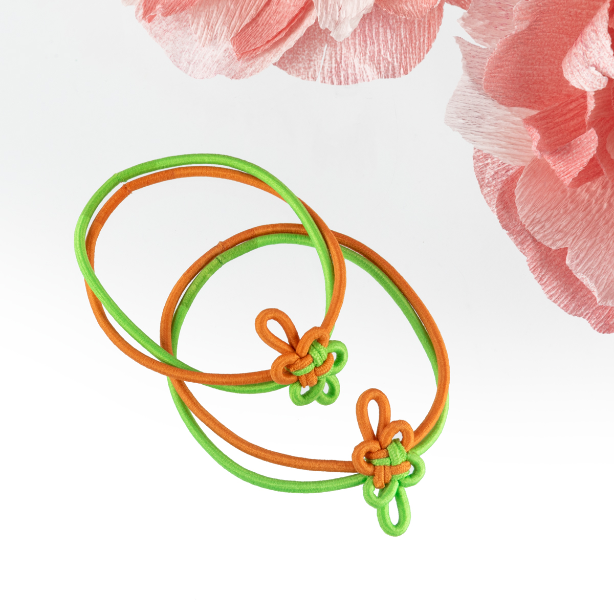 Набор резинок для волос, 2 шт., ярких цветов - зелёный и оранжевый с фантазийным узором. Резинки изготовлены из прочного полиэстера, который обеспечивает долгий срок службы. Они не теряют своего внешнего вида и надежно удерживают даже самые густые и непослушные волосы. Удобны в использовании - крепко фиксируют, легко снимаются, не запутывая волосы. Диаметр резинки 5,5см, поэтому такой аксессуар отлично подойдёт для самых густых волос.