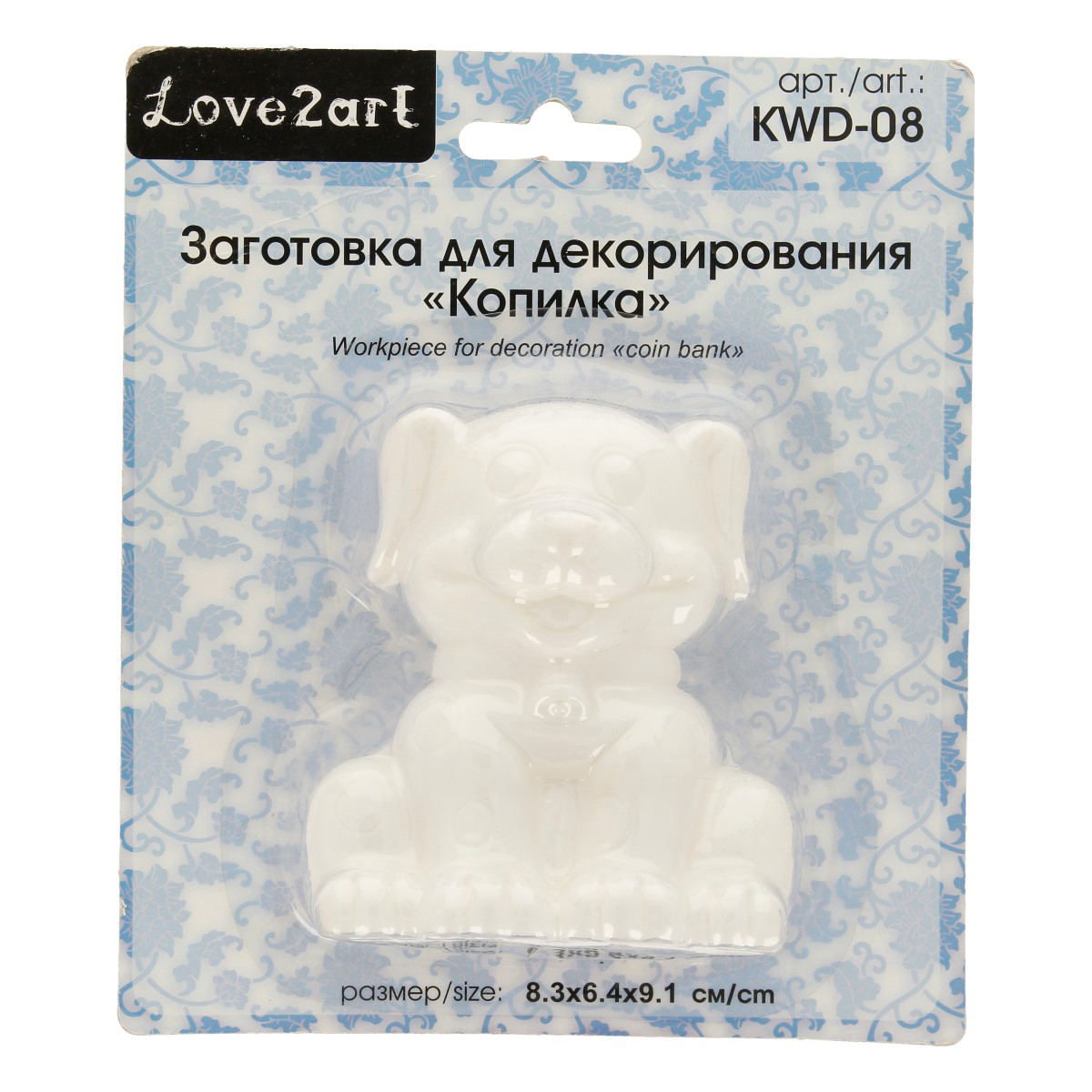 "Love2art" KWD-08 Заготовка для декорирования "копилка" "собака". Заготовка сделана из прочного легкого приятного на ощупь пластика в форме копилки. На дне копилки имеется отверстие с крышкой. Поверхность заготовки хорошо поддается художественной обработке акриловыми красками и декорируется в технике Декупаж. Объемная заготовка "копилки" помогает ребенку проявить фантазию, развивать мелкую моторику, цветовосприятие и раскрывает творческие способности ребенка.