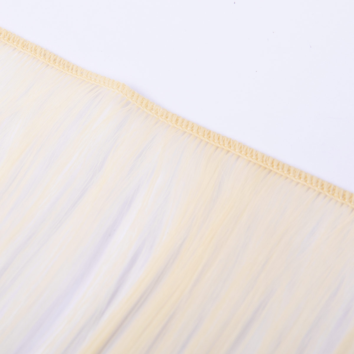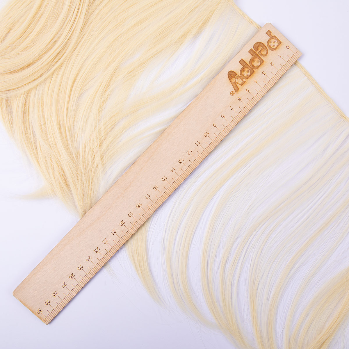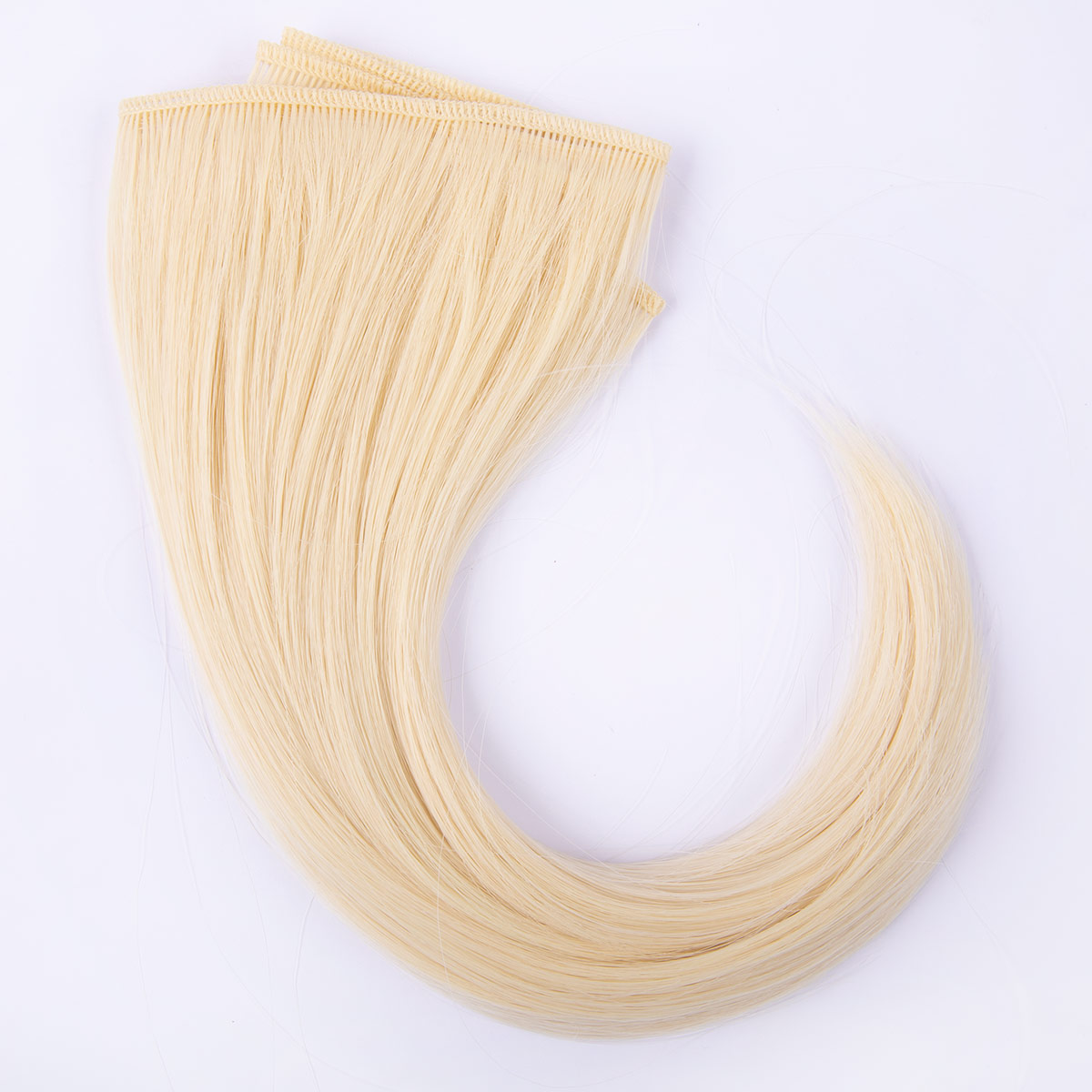 Волосы закреплены с помощью нитки в цвет пряди, сшитой зигзагом. Благодаря своей конструкции волосы не выпадают и крепко держатся на кукле.