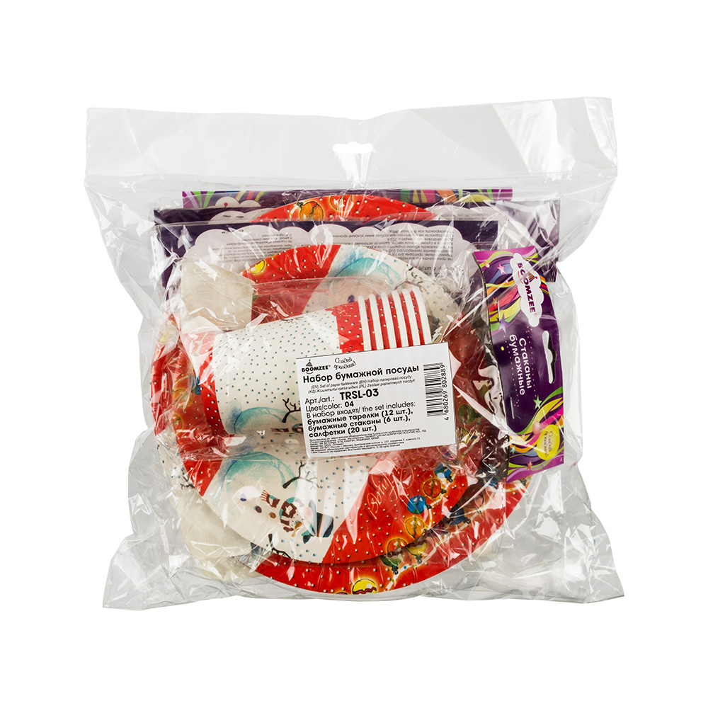Набор бумажной продукции торговой марки "BOOMZEE" арт.TRSL-03 Создайте праздник, приложив минимум усилий. Практичность и яркие дизайны одноразовой посуды помогут Вам в этом. Вы получите массу приятных впечатлений, праздничную атмосферу, а сервировка и уборка стола не отнимут у вас много времени. Создай свой праздник: Новый год, день Рождения, свадьба, рождение сына или дочери, день святого Валентина и т.д. Выберите наборы для своего праздника: разные размеры и формы. Предназначены для подачи холодных и горячих блюд. Нельзя использовать в микроволновой печи. В наборы TRSL-03 входят: 01 - бумажные тарелки 23 см, 6 шт. - бумажные тарелки 18 см, 6 шт. - бумажные стаканчики, 6 шт. - салфетки, 20 шт.