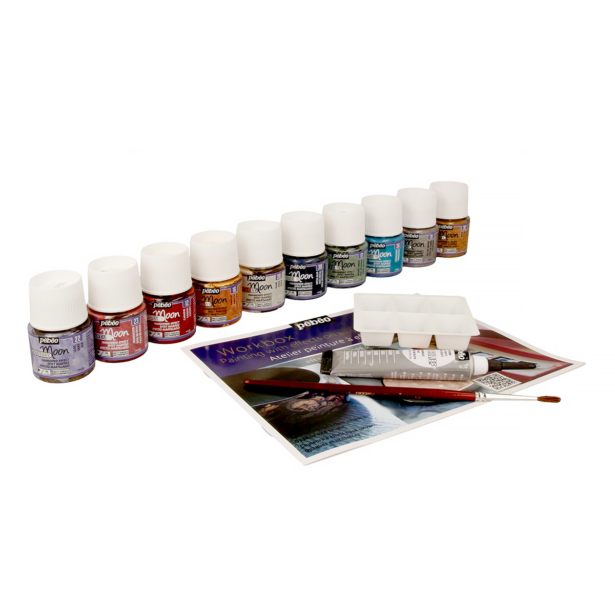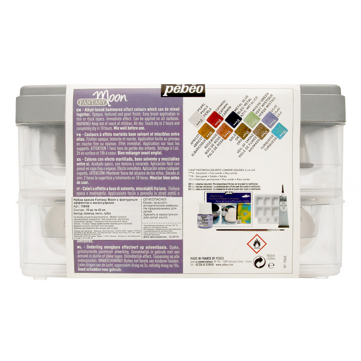 Краски Fantasy Moon идеально подходят для смешанных техник Pebeo. Наносятся плоской кистью тонким или толстым слоем на обезжиренныеповерхности ,могут быть нанесены на влажные прозрачные витражные краски Vitrail для получения эффекта мраморной поверхности.