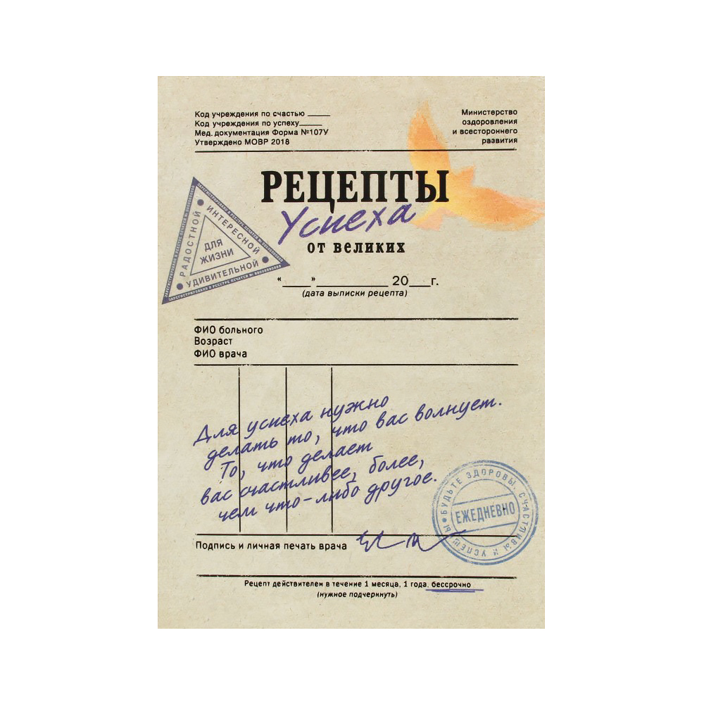 Ежедневник для всех, кто хочет быть ежедневно-успешным, верит в себя, стремится к саморазвитию. А также представителям медицинских профессий Данный ежедневник – не просто очередной сборник афоризмов. Это сборник рецептов , в котором великие люди на один день становятся вашими персональными лечащими врачами. Каждый лист ежедневника представляет собой рецепт счастья с подписью известного человека и личной печатью «врача». И все они «выписаны» людьми, которым удалось достигнуть в этой жизни самых головокружительных высот: всемирной славы, многомиллионного богатства, успеха в самых дерзких и несбыточных, как казалось некоторым маловерам, начинаниях. А рецепт тем и хорош, что применим на практике. Доверьтесь опытным «врачам» и их рекомендациям, читайте, вдохновляйтесь и будьте счастливы и успешны – прямо сейчас и изо дня в день! Материал: бумага, картон, 80 рецептов успеха.