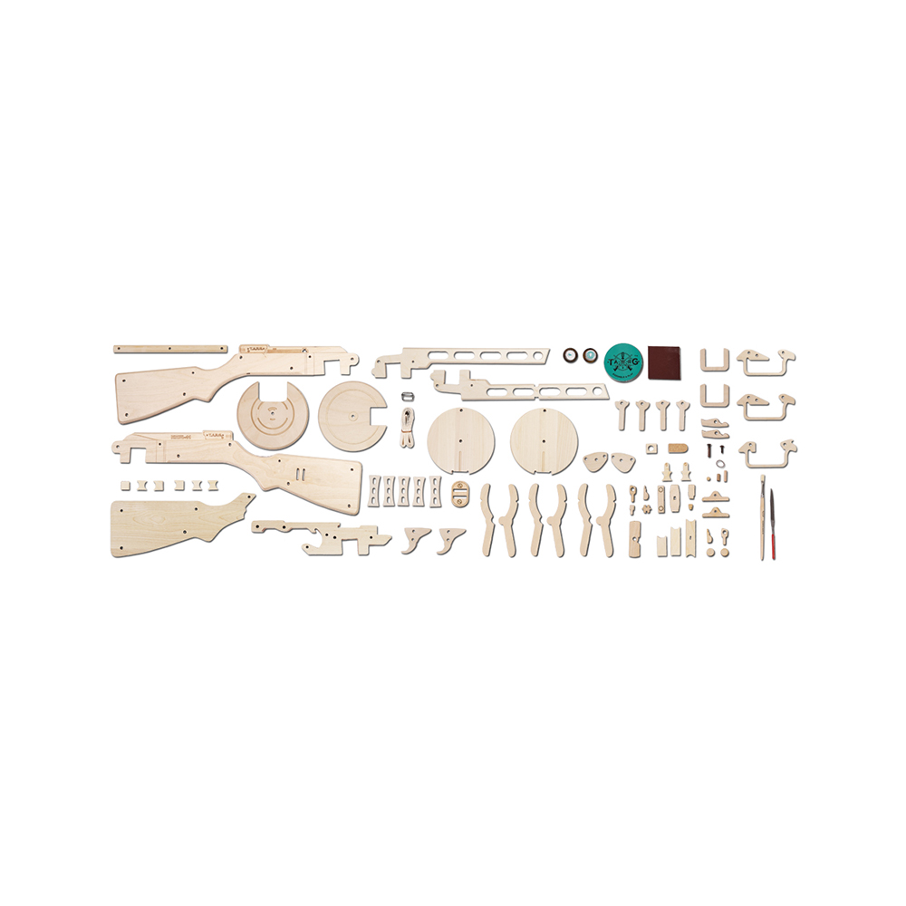 ППШ-41 — модель-макет самого известного пистолета-пулемета советских вооруженных сил времени Великой Отечественной Войны. Время сборки — 3-4 часа. В комплект элементов для моделирования входят: 54 детали, клей ПВА, акриловый лак, кисточка, надфиль, наждачная бумага, стяжки, шурупы, ремень, резинки, металлическая баночка для хранения. Внутренний механизм модели издаёт звук. Набор полностью укомплектован. Для сборки вам потребуется крестовая отвертка. Из-за характерных особенностей конструкции ствола модели рекомендуем при склейке использовать струбцины, которые входят в комплект. Лак и клей, входящие в набор, не токсичны и безопасны для детей. Товар сертифицирован РОСТЕСТ-МОСКВА