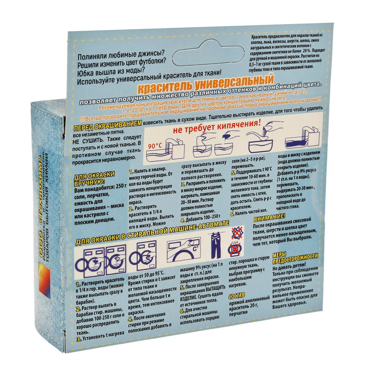 Предназначен для окраски тканей из хлопка, льна, шерсти, шелка, смеси натуральных и синтетических волокон, где синтетики не более 20%. Рассчитан на 1 кг сухой ткани в зависимости от желаемой глубины тона и типа окрашиваемой ткани. Желаемый результат можно получить только при соблюдении инструкции на упаковке.