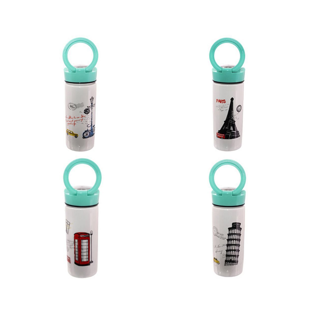Бутылка для воды белая с завинчивающейся крышкой зеленого цвета и поднимающимся держателем в виде кольца из пластика. Объем: 320 мл, размер: L7 W7 H18 см, упаковка-коробка. Представлено в четырех вариантах.