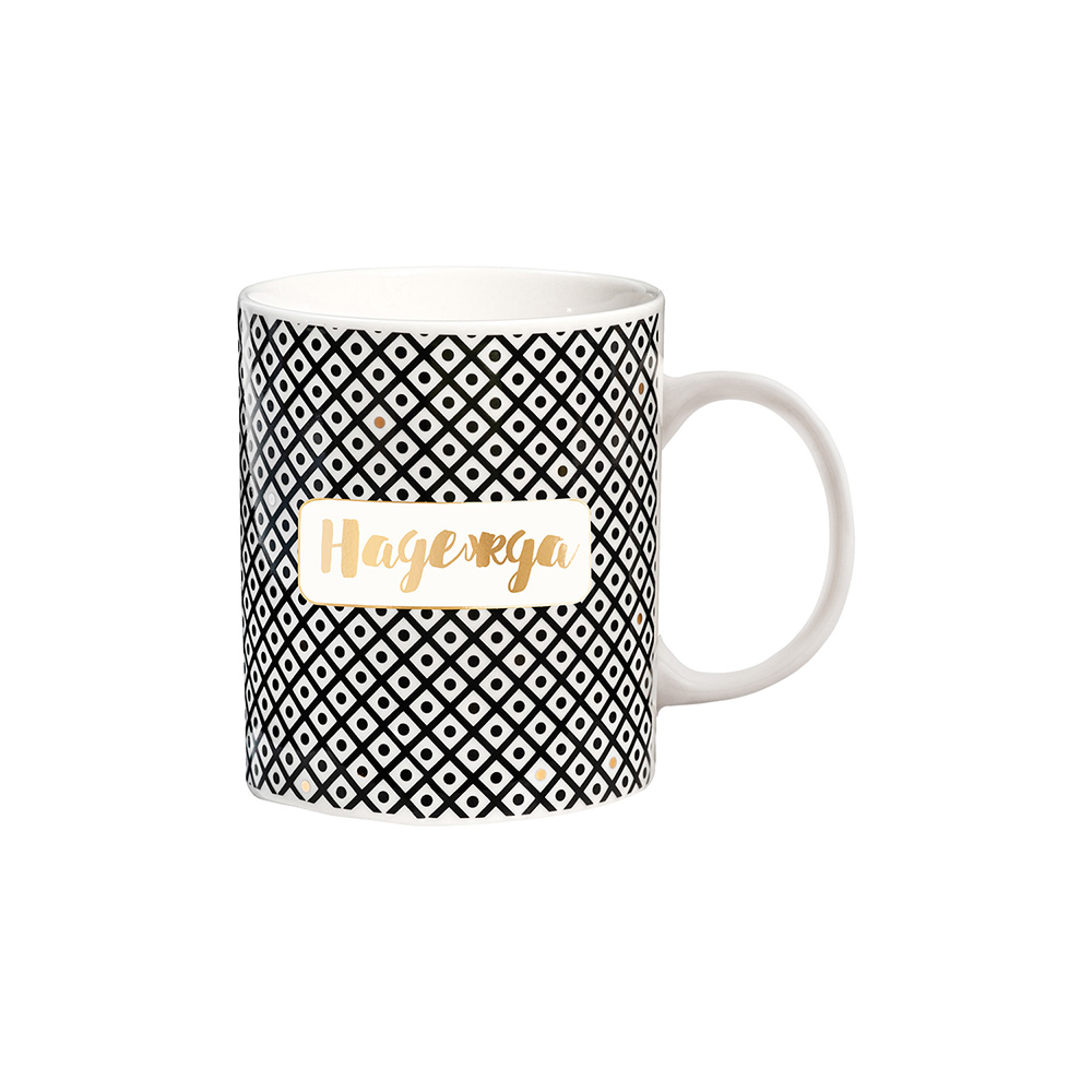 Чашка изготовлена из керамики и выполнена в черно-белой гамме с золотистыми элементами.