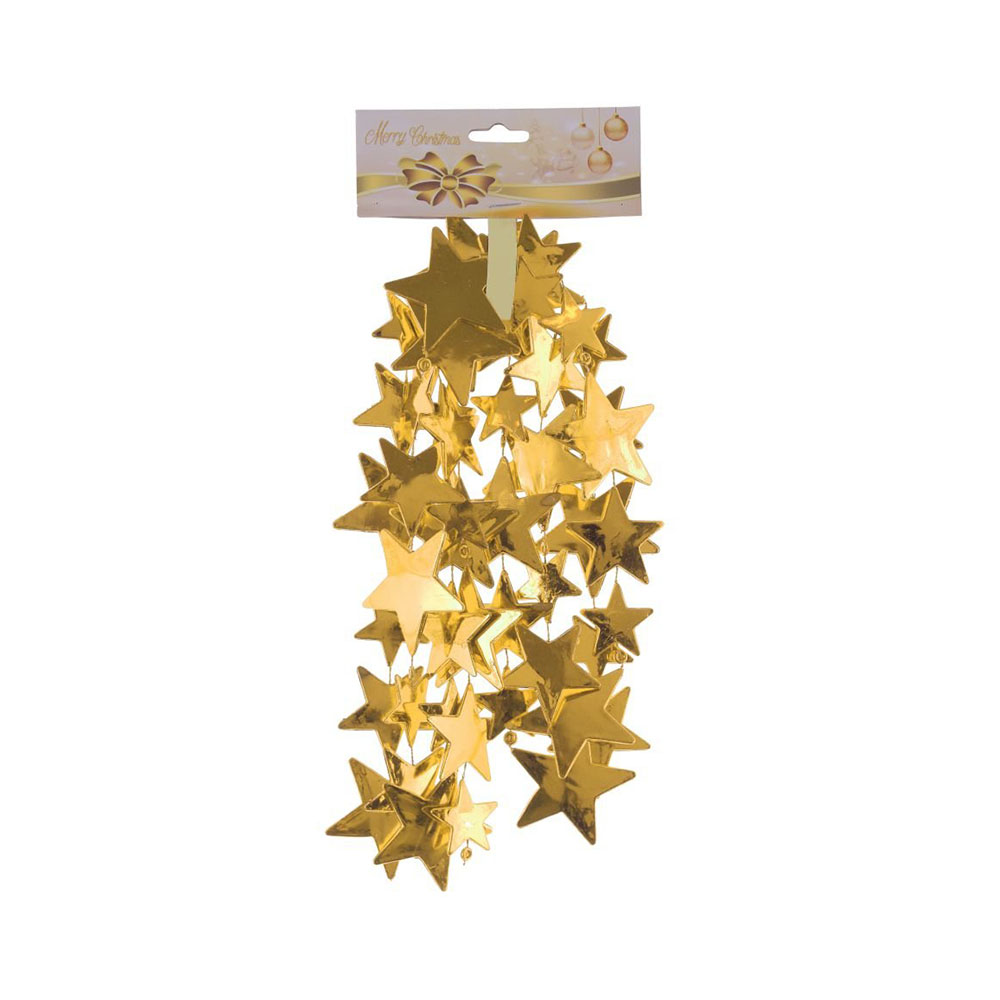 Новогоднее украшение "Бусы" из звездочек разного размера от 3 см до 5,6 см. Длина нитки 180 см. Цвет - золото. Изготовлены из пластика. Прекрасное украшение для елки и интерьера. Упаковка- пакет