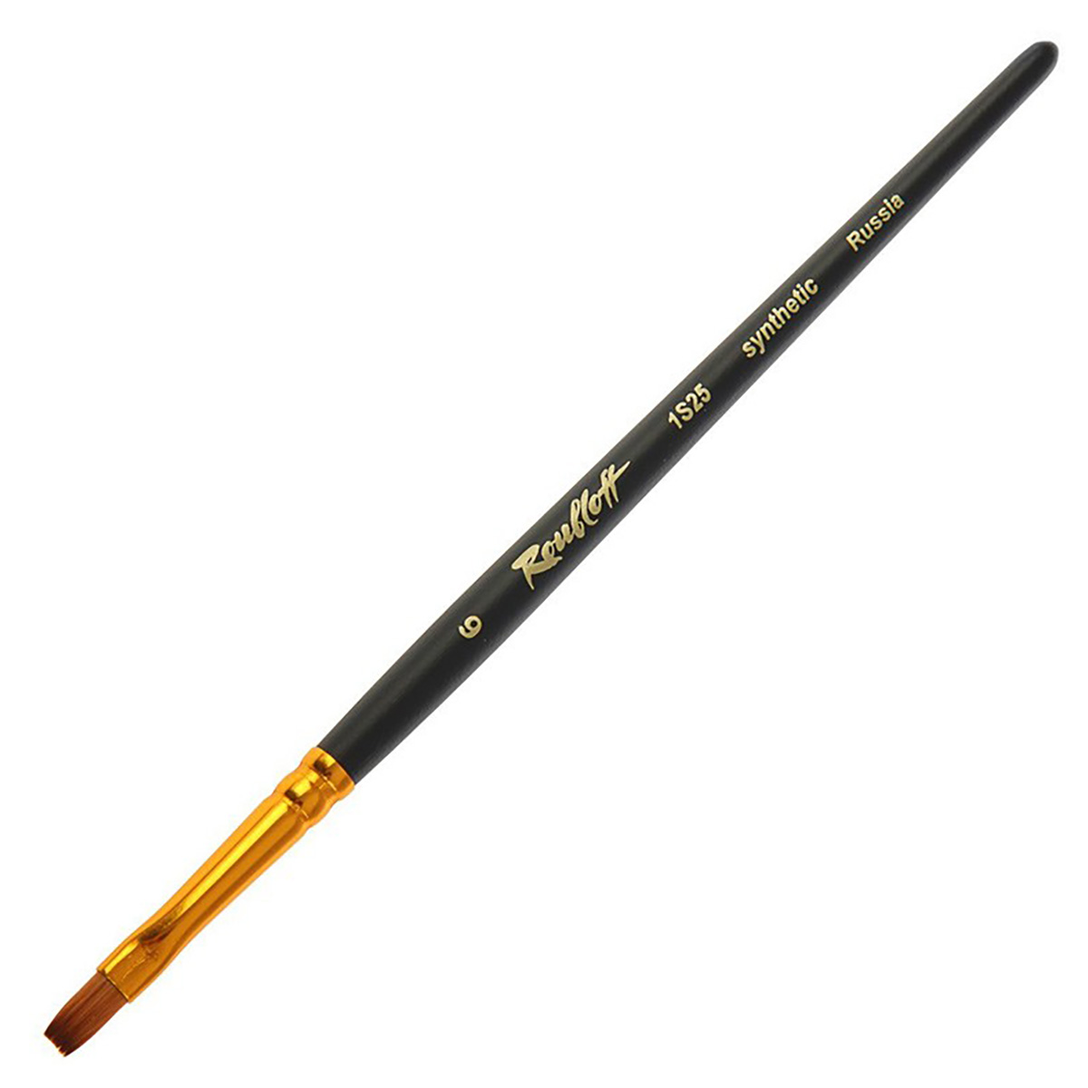 Плоская кисть из синтетики под колонок. Рыжая жесткая синтетика является хорошей заменой колонка. Тонкий волос мягкой синтетики прекрасно подходит для работы с жидкими красками. Умеренная цена на волос делает кисти более доступными. Плоская кисть используется для нанесения фона, выполнения колеровки, прорисовки краеугольных форм и прямых линий. С укороченной выставкой может использоваться как вершинка, так и вся поверхность мазка, что позволяет получать толстые мазки или тонкие линии. Алюминиевая анодированная [золотистая] обойма. Короткая черная матовая ручка.
