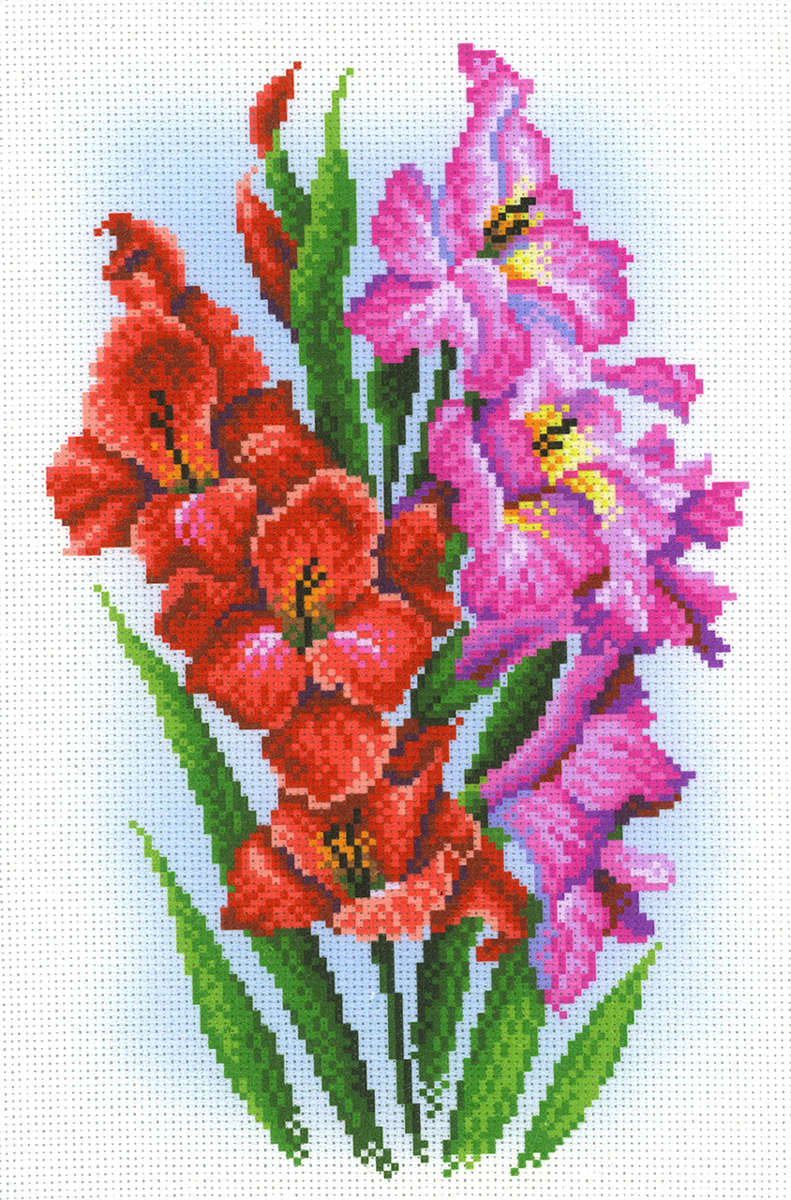 Канва с рисунком ТМ "М.П.Студия" СК-056 "Гордые гладиолусы" Состав: Канва Аида 14 с нанесенным рисунком-схемой, количество цветов мулине - 21, нитки приобретаются отдельно, полная зашивка. Размер: 40*30/19*28