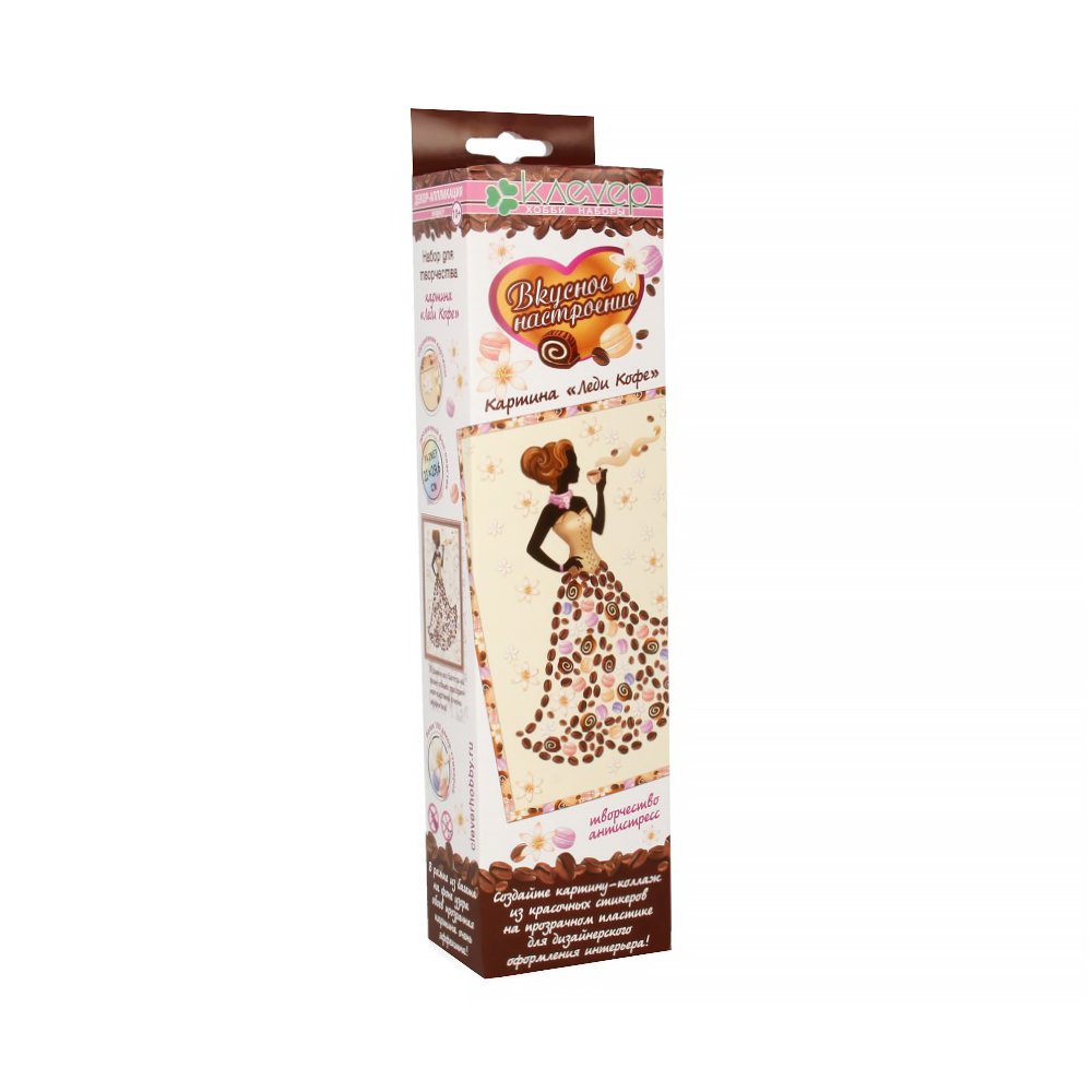Набор для изготовления картины "Леди Кофе". Создание картин из серии "Вкусное настроение" понравится подросткам старше 10 лет и взрослым. Изящество силуэта девушки с чашкой кофе нестандартно сочетается с яркостью "вкусных" стикеров на платье, разлетающихся в вихре радостного настроения. Картина легка в исполнении: на прозрачный пластик наклеиваются детали-самоклейки и дизайнерские стикеры. Картина будет оригинально смотреться в любом интерьере! Комплектация: детали из цветной самоклейки, прозрачный пластик, инструкция на упаковке. Размер готового изделия: 295x210 мм. Возраст: для детей старше 10 лет.