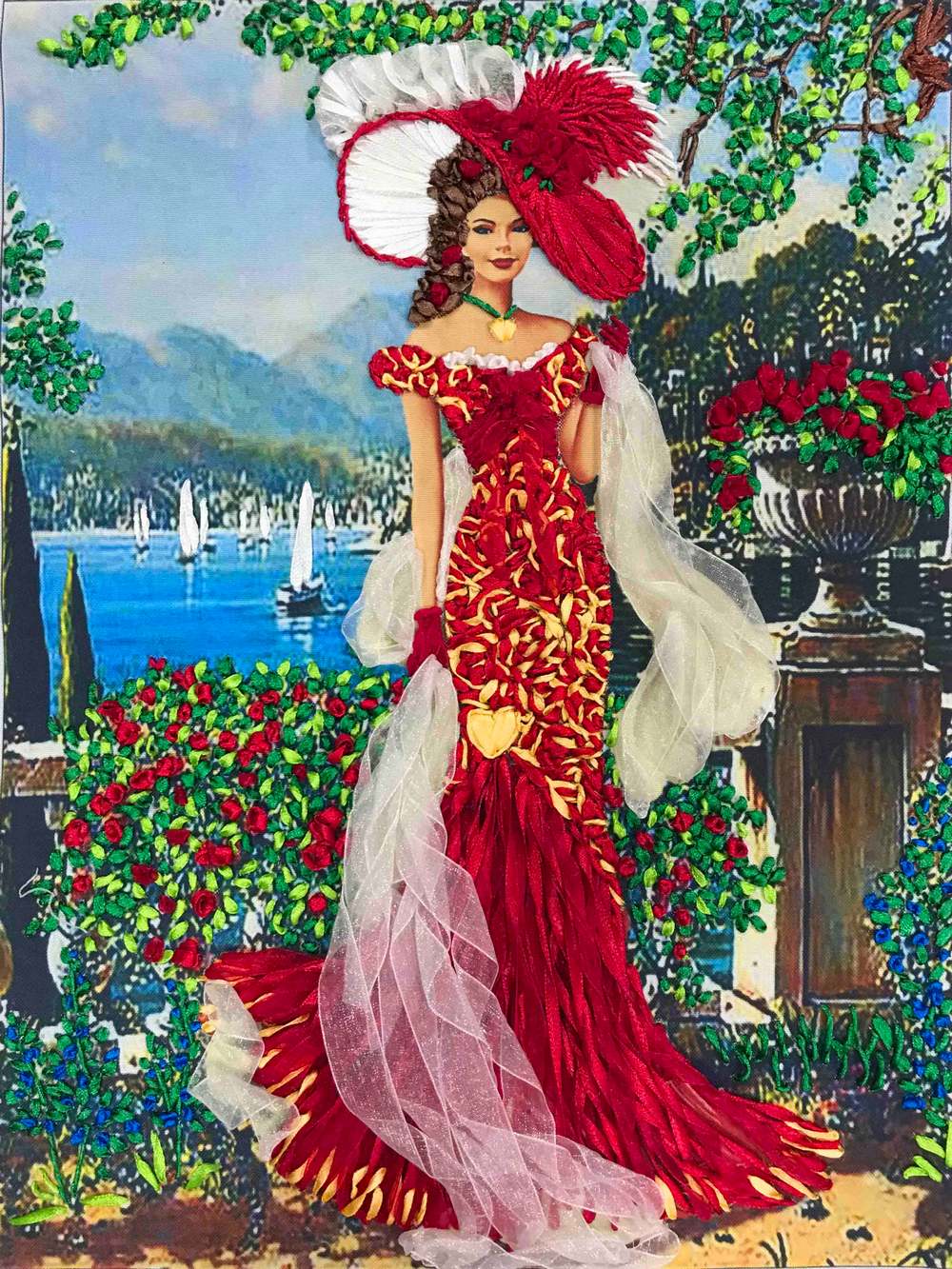 Набор для вышивки лентами В набор входит: Ткань с нанеченным рисунком /габардин/ Ленты атласные разных размеров 100% полиэстер на органайзере Мулине х/б на органайзере [если указано в схеме] Иголка Цветная схема на бумаге 2 инструкции Изображение вышитой работы Размер вышитой работы 27 х 37 см Цветов: 9
