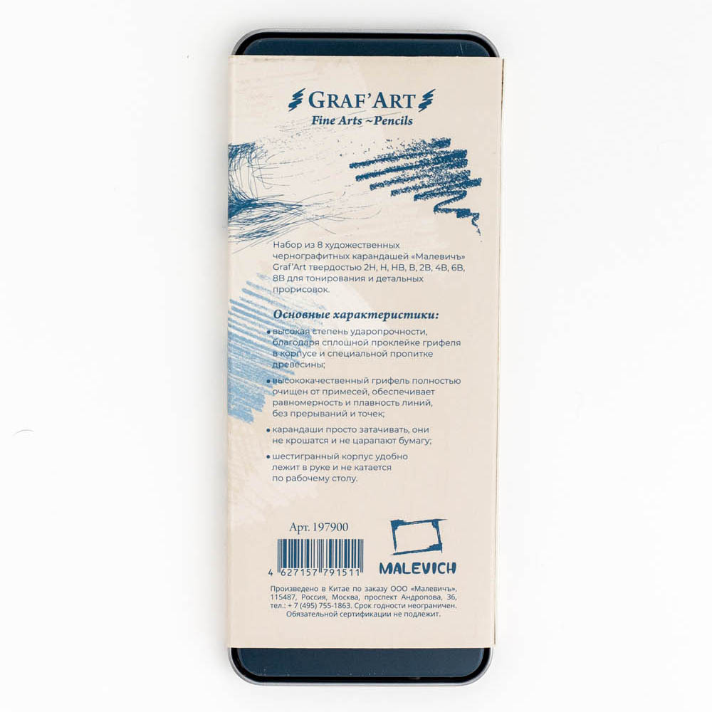 Художественные чернографитные карандаши Малевичъ Graf'Art предназначены для рисования и отвечают всем требованиям предъявляемым к профессиональной художественной продукции. Высококачественный грифель очищен от примесей за счет чего штриховка получается равномерной и четкой. Диаметр грифеля отличается в зависимости от степени мягкости карандаша. Высококачественная древесина обеспечивает легкое затачивание, корпус и грифель не крошится и остаются целыми даже при падении карандаша. В коллекции 8 степеней мягкости: 2Н, Н, НВ, В, 2В, 4В, 6В, 8В.
