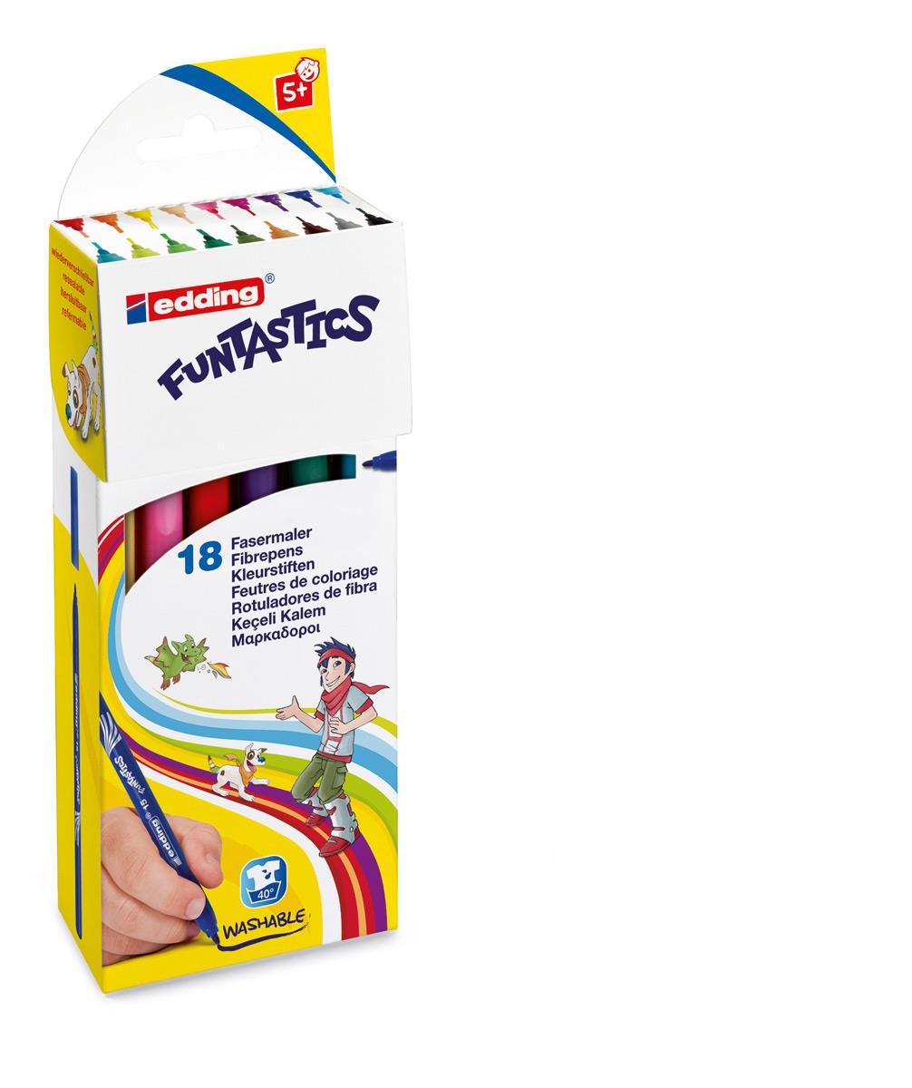 Фломастеры edding FUNTASTICS, толщина линии 1мм, чернила на основе пищевых красителей, абсолютно безвредных для здоровья детей, легко смываются с рук и отстирываются с одежды. В наборе 18 цветов.