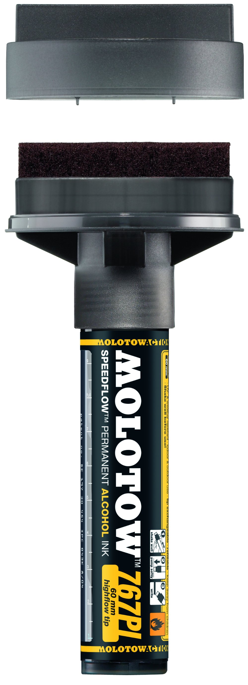 Самый большой маркер в линейке Molotow, он дает возможность быстро работать по большим поверхностям без потери качества. Линия имеет ширину до 60 мм, но благодаря восьмиканальной системе и особому клапану чернила ложатся равномерно и плотно, да к тому же и без подтеков.