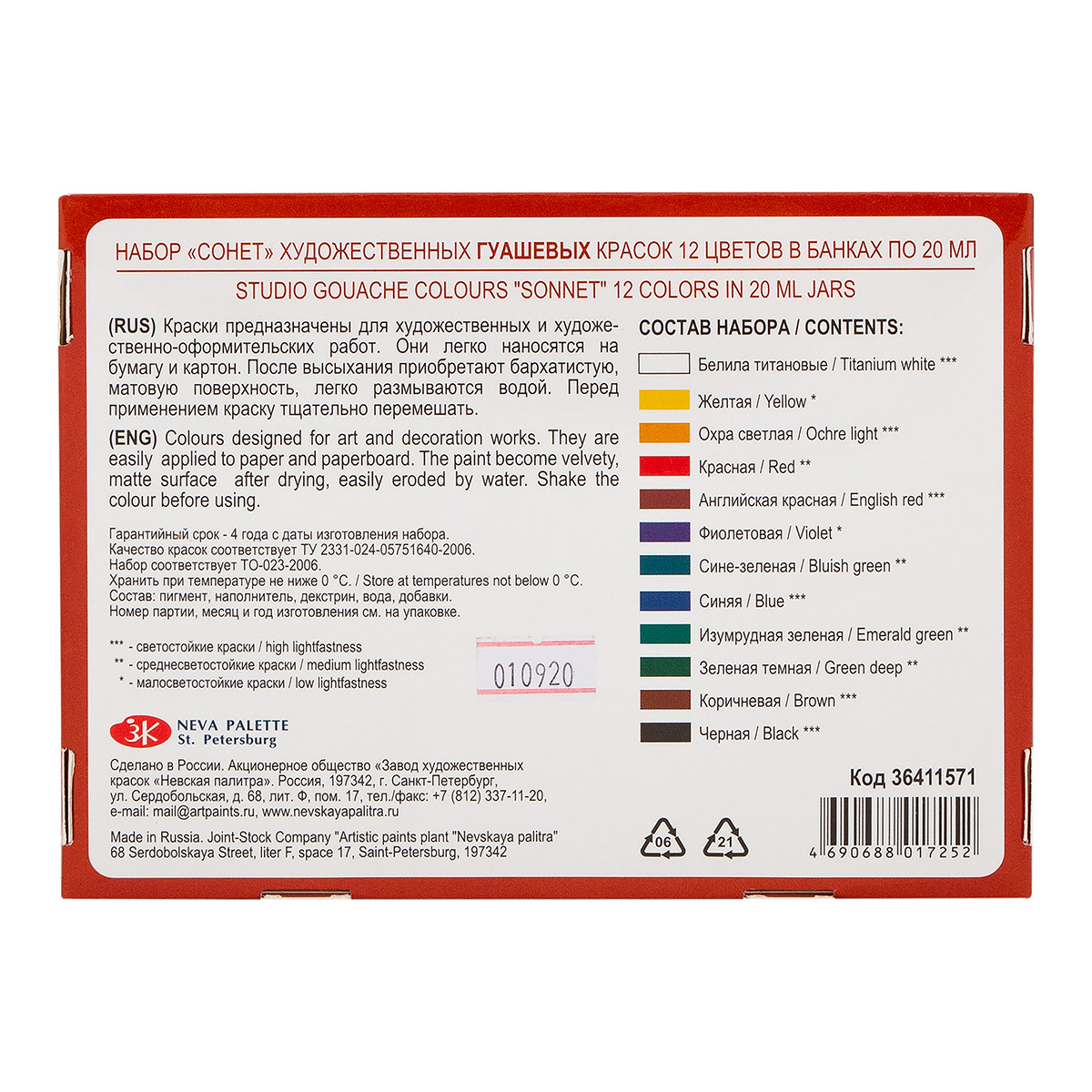 Набор гуаши Сонет облегчит ваш творческий процесс. Краски выпускаются заводом “Невская палитра”, который уже более 80 лет специализируется на производстве художественной продукции. Гуашь Сонет подойдет как для художественно-оформительских работ, так и для детского творчества. В набор входит 12 цветов, при производстве которых использованы пигментные пасты и синтетическое связующее. Это отличает их по рецептуре от профессиональной гуаши. Краски ложатся бархатисто матовым слоем на бумагу и картон. Они отлично взаимодействуют с водой — легко размываются.