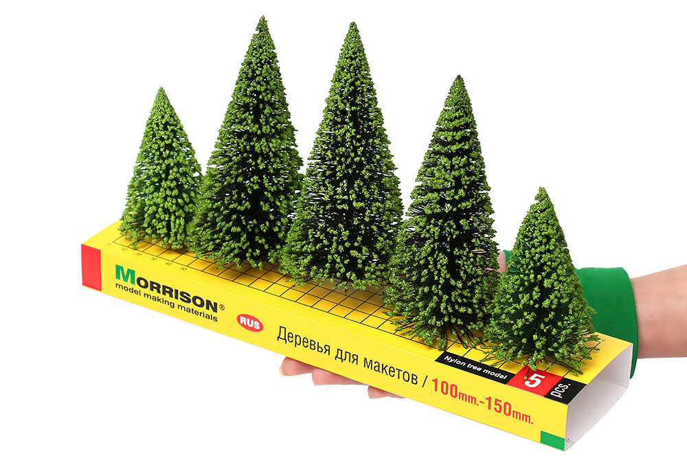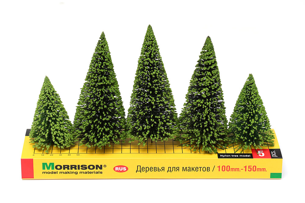 Набор миниатюрных декорированных хвойных деревьев 5 штук высотой 10-15 см. Рекомендуются к использованию в макетах железных дорог, при создании военных диорам и архитектурных макетов в масштабе 1:72, 1:87, 1:100, 1:150.