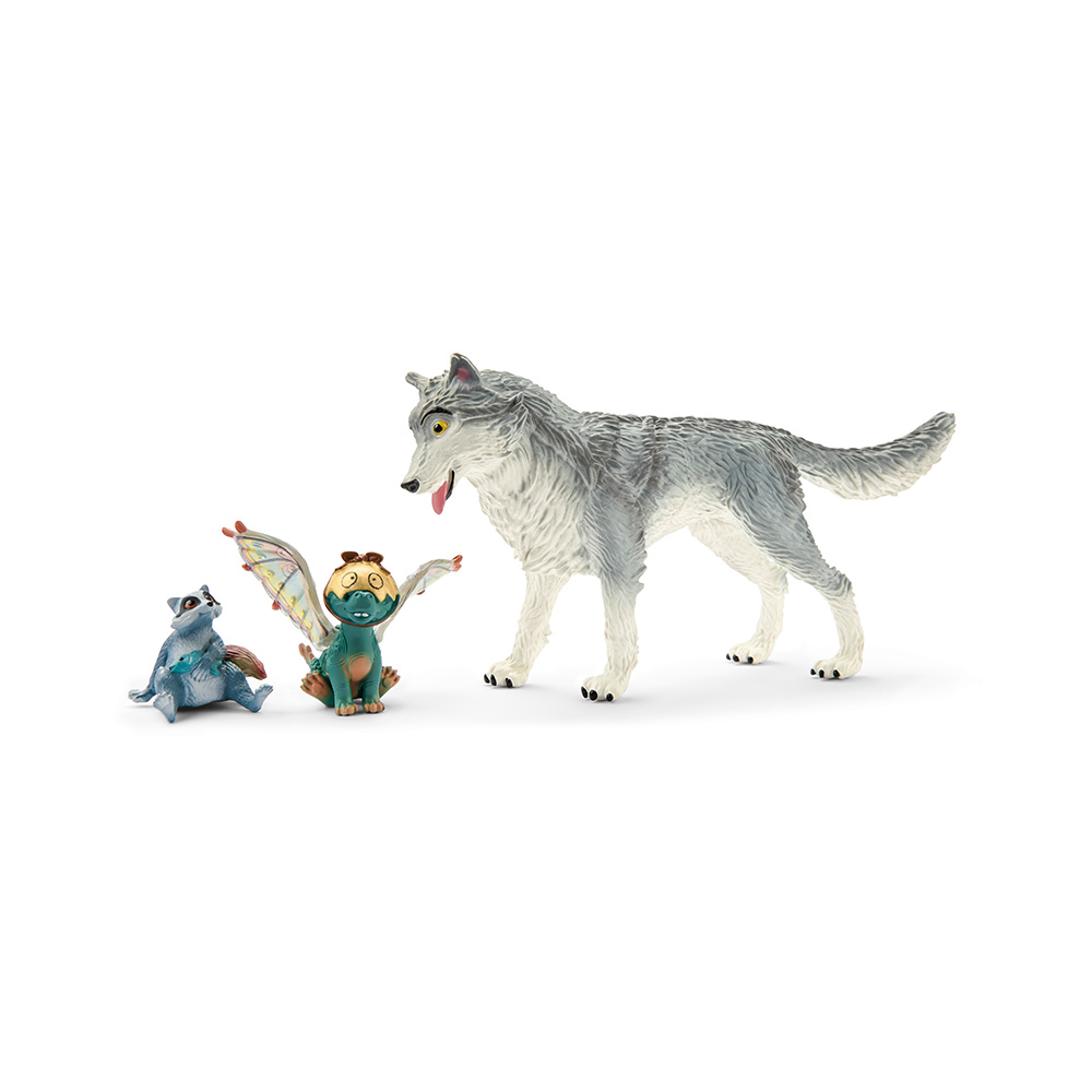 Набор Schleich Волк Лайкос, дракон Нугур и енот Пиу — персонажи из фильма Феи: тайна страны драконов. Эти трое стали ближайшими друзьями в авантюрном путешествии к драконам, родителям Нугура. С тех пор они больше никогда не разлучались и резвятся на цветущей природе мира Bayala. Яичную скорлупу Нугур носит только тогда, когда играет в переодевание, Пиу, напротив, предпочитает перекусить и поедает всё, что попадает ему под лапу. К счастью, Ликос заботится о них! Интересный факт: любимое блюдо малыша Нугура — драконий фрукт.