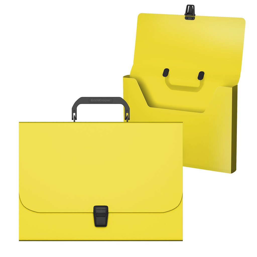 Портфель формата А4 из высококачественного пластика с текстурой поверхности "песок", на которой не видно отпечатков пальцев и мелких царапин. Предназначен для транспортировки документов. Цвет портфеля - желтый. Портфель вмещает до 350 бумажных листов. Оснащен фирменным замком и ручкой с логотипом ErichKrause®. Размер - 335х230х35мм, толщина - 0.7мм.