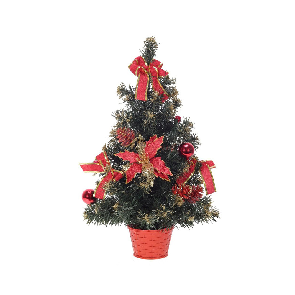 Елка искусственная с украшениями высотой 51см. Изготовлена из металла , полимерной пленки и фольги.Игрушки и корзина - из пластика, цветы и бант - из текстиля, шишки натуральные. Все украшения в золотом цвете. Создаст праздничную обстановку и украсит любой интерьер.Упаковка- пакет