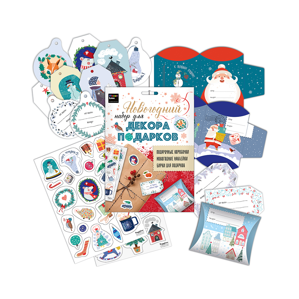 Набор «Новогодний набор для декора подарков». Состав набора: коробочки для упаковки небольших подарков – 3 шт., бирки-открытки для подарков, наклейки с авторскими иллюстрациями. Материал: бумага, картон. Возраст: от 3 лет