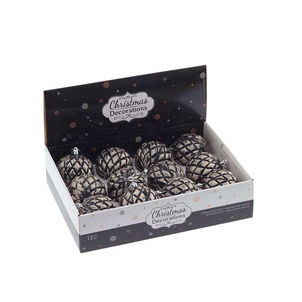 Набор шаров для елки в шоу-боксе. Эти новогодние шары серебряного цвета с черным узором непременно порадуют вас своим изяществом и прекрасно дополнят праздничный наряд лесной красавицы.