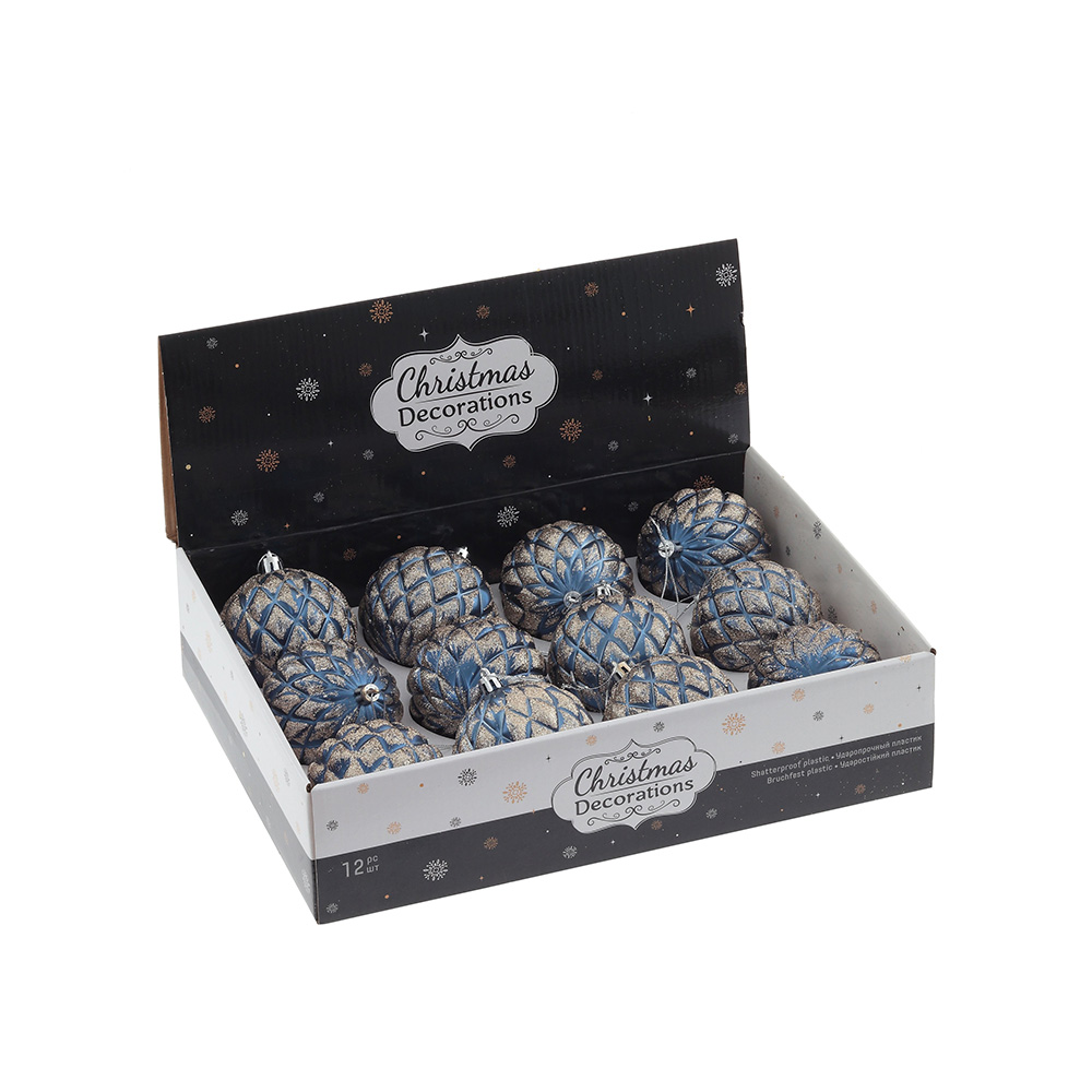 Набор шаров для елки в шоу-боксе. Эти новогодние шары серебряного цвета с синим узором непременно порадуют вас своим изяществом и прекрасно дополнят праздничный наряд лесной красавицы.