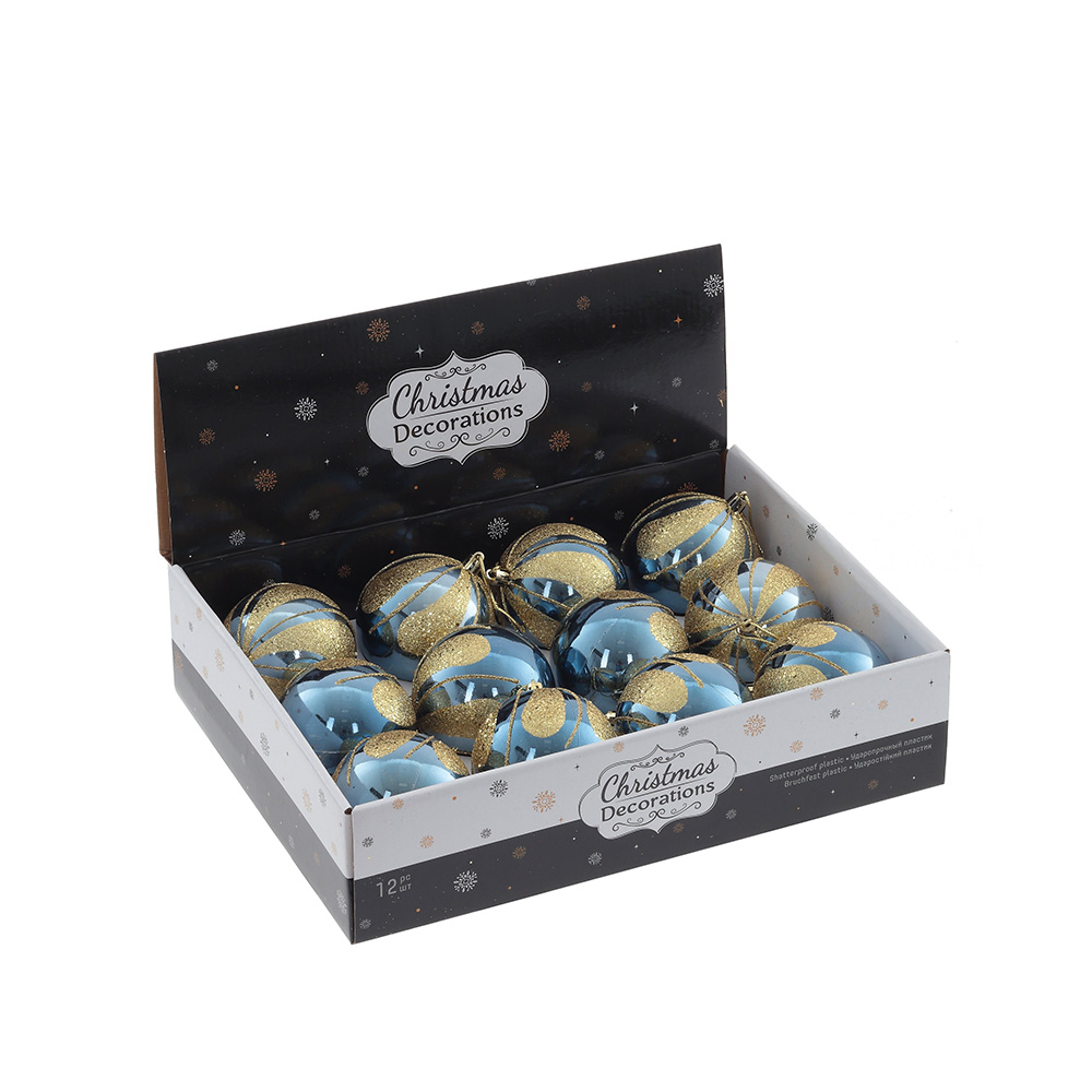 Набор шаров для елки в шоу-боксе. Эти новогодние шары голубого цвета с кокетливым узором непременно порадуют вас своим изяществом и прекрасно дополнят праздничный наряд лесной красавицы.