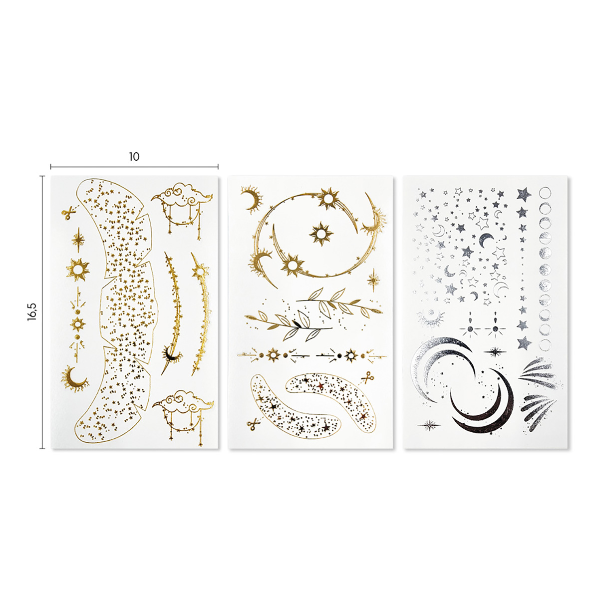 Набор тату-переводилок в картонной упаковке. В набор входят 30 переводилок с элементами ночного неба и цветочными принтами. В наборе есть как "золото" так и "серебро"! Тату наносятся с помощью воды или влажной салфетки . Стильная подарочная упаковка.