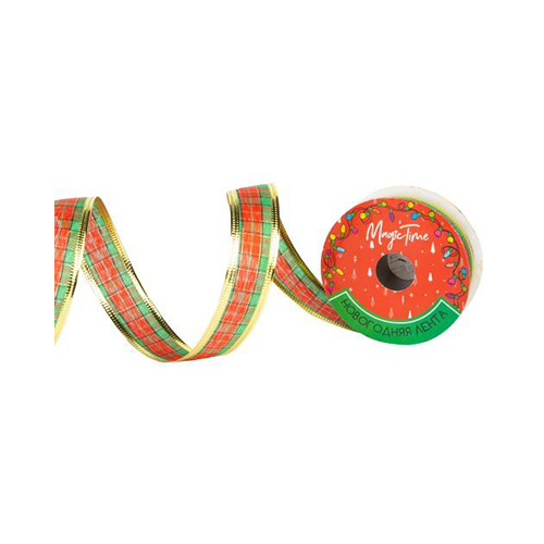 Новогодние ленты широко применяются для украшения праздничных елей и помещений к Новому году. С их помощью создаются пышные банты, гирлянды, а также другие декоративные элементы. Лента может служить и частью оформления подарка, создавая по-настоящему праздничное настроение. Лента выполнена из полиэстера, некоторые детали которого украшает металлизированный эффект. Ширина ленты 2,5 см, а длина 2.7 м. Для удобства транспортировки и хранения лента обернута вокруг катушки из плотного картона.